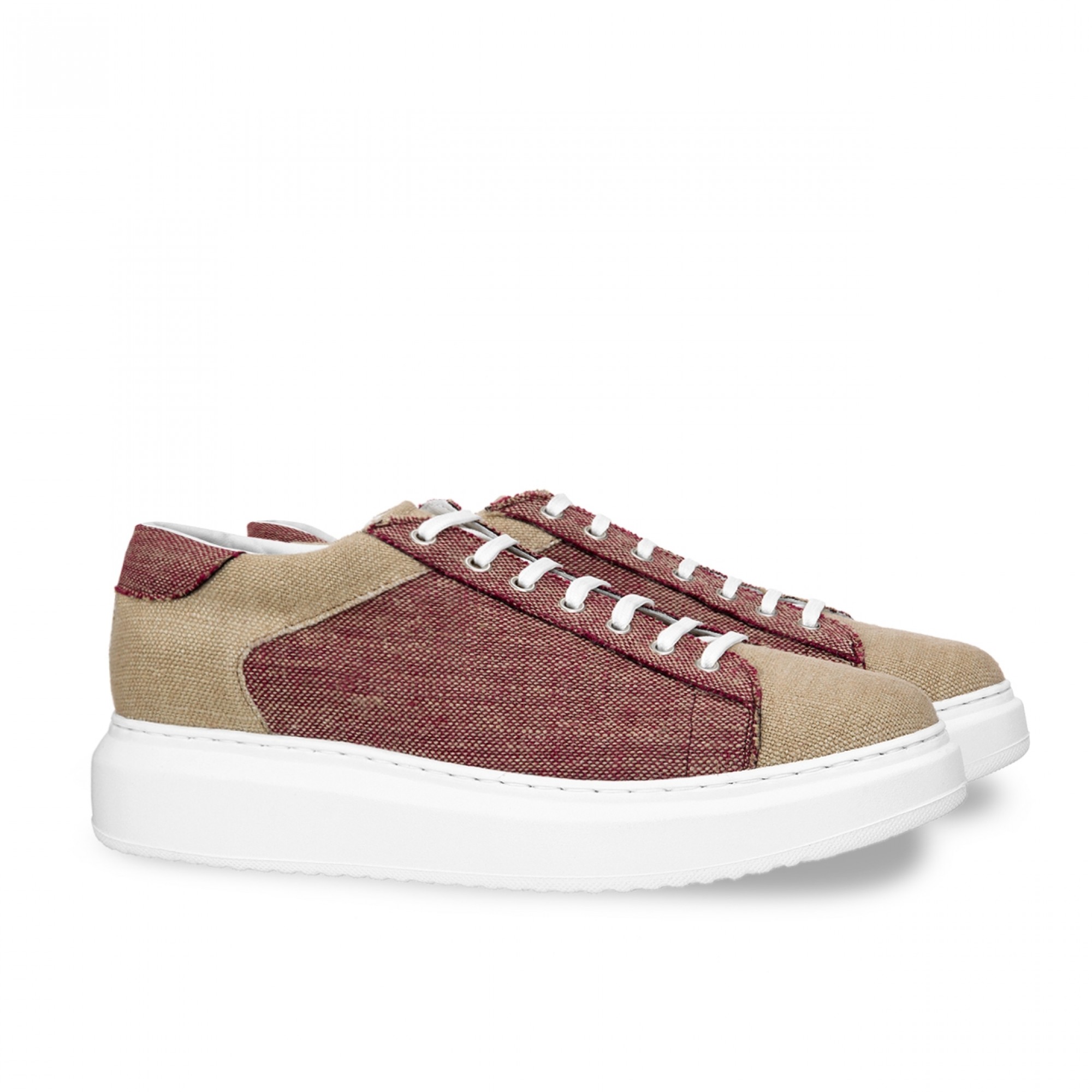 Elevator sneakers handmade in Italy with upper in pure sand raffia and orange fabric that recalls the colors of the sunsets of the Greek island of Lefkada. The white sole is made of natural rubber.