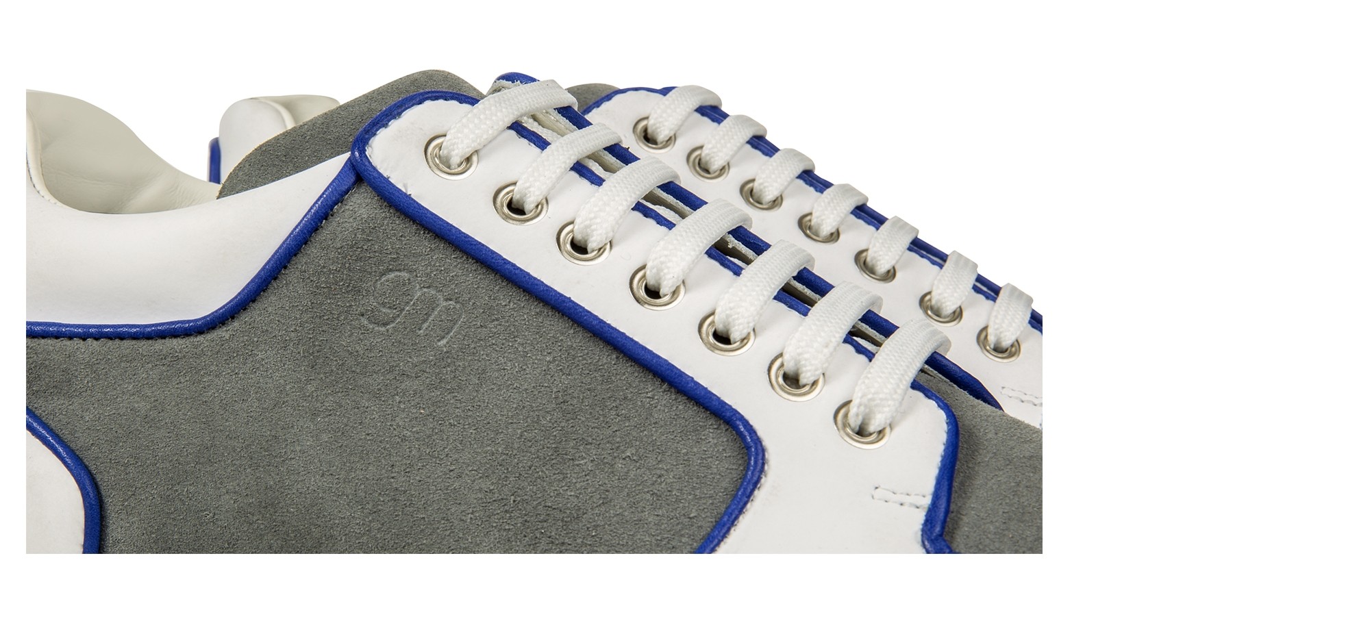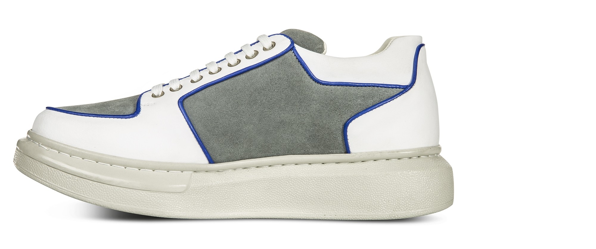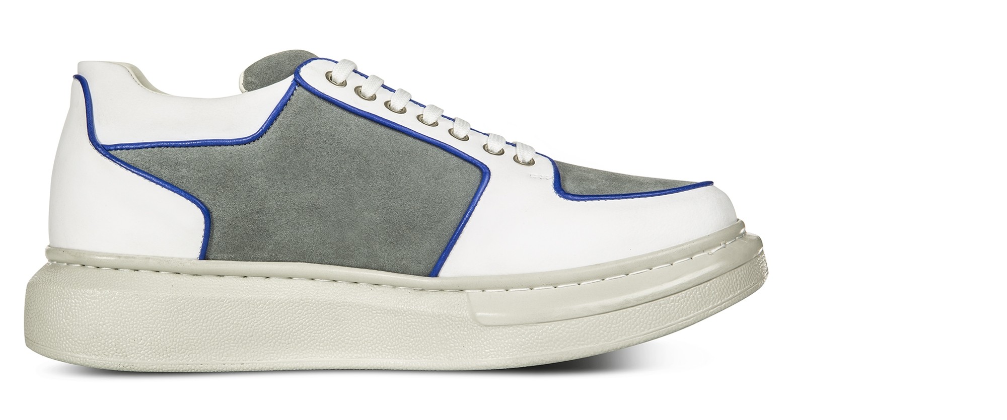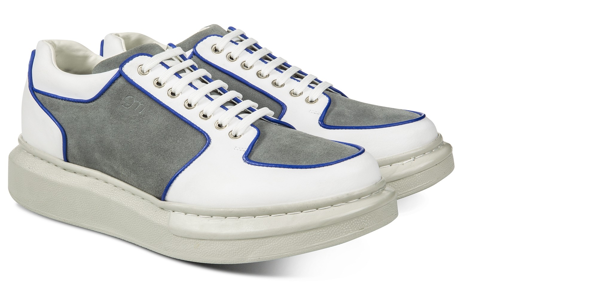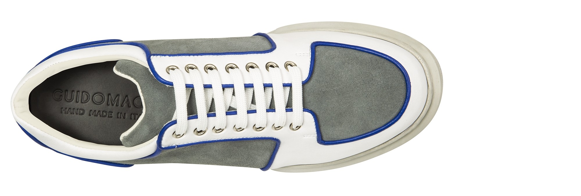 Dynamic and with curved lines, the new GuidoMaggi sneakers for men are a masterpiece of style. The upper is made of a soft suede mix and a white full-grain embellished with captivating blue piping.