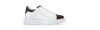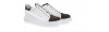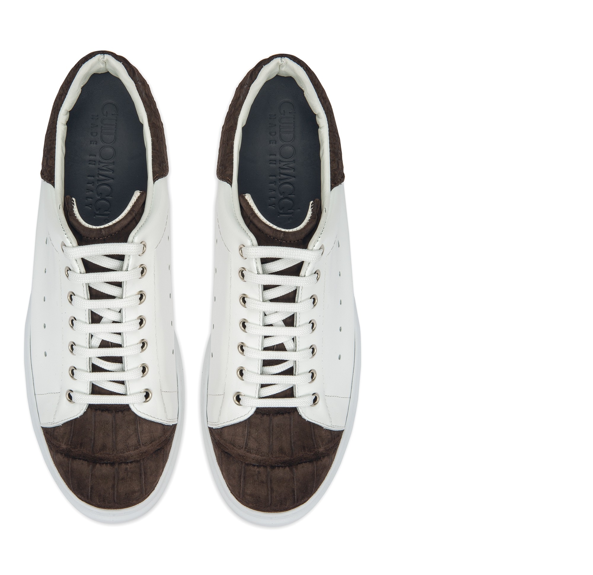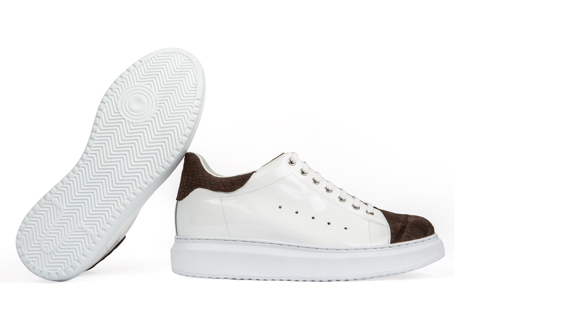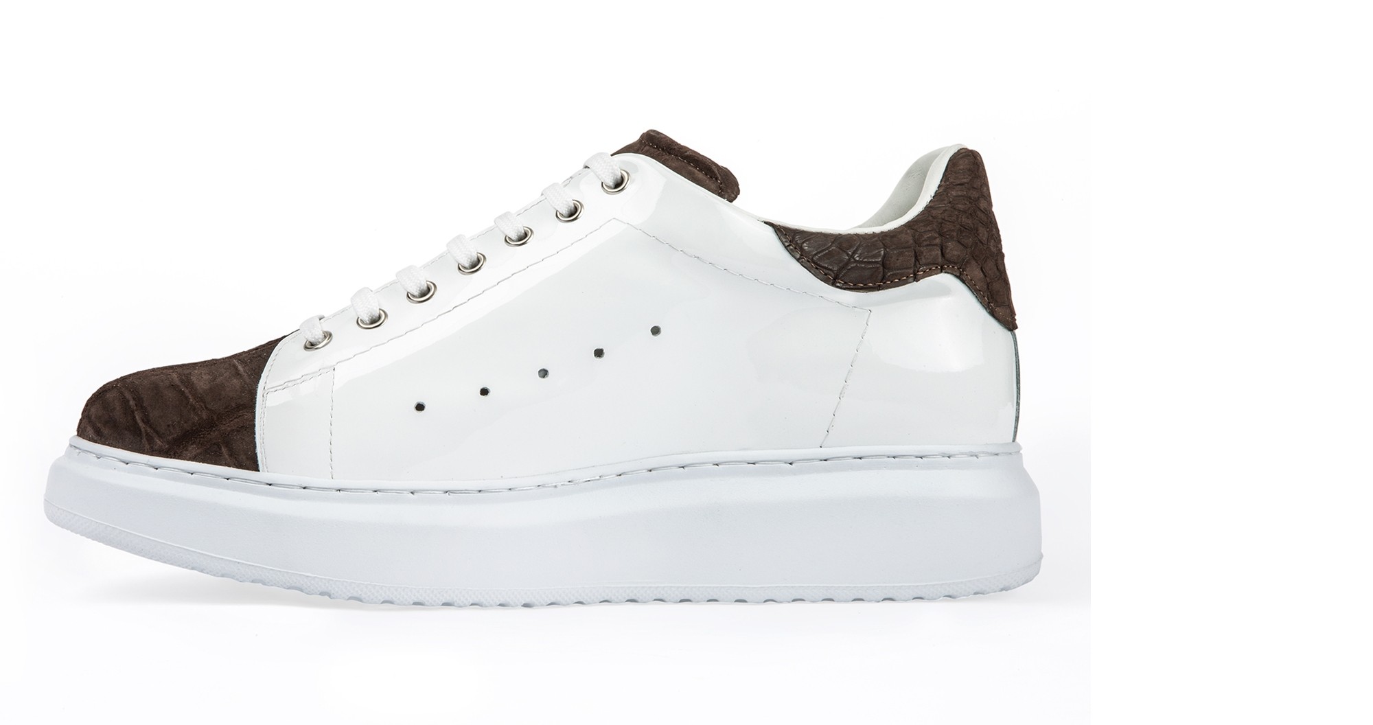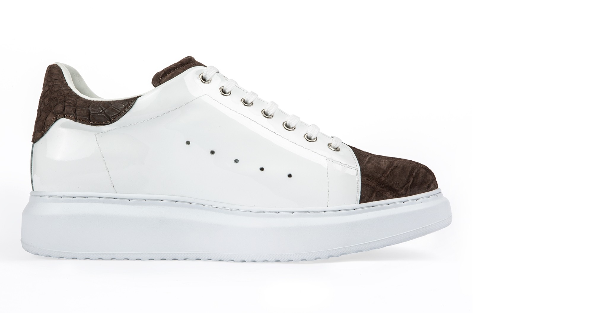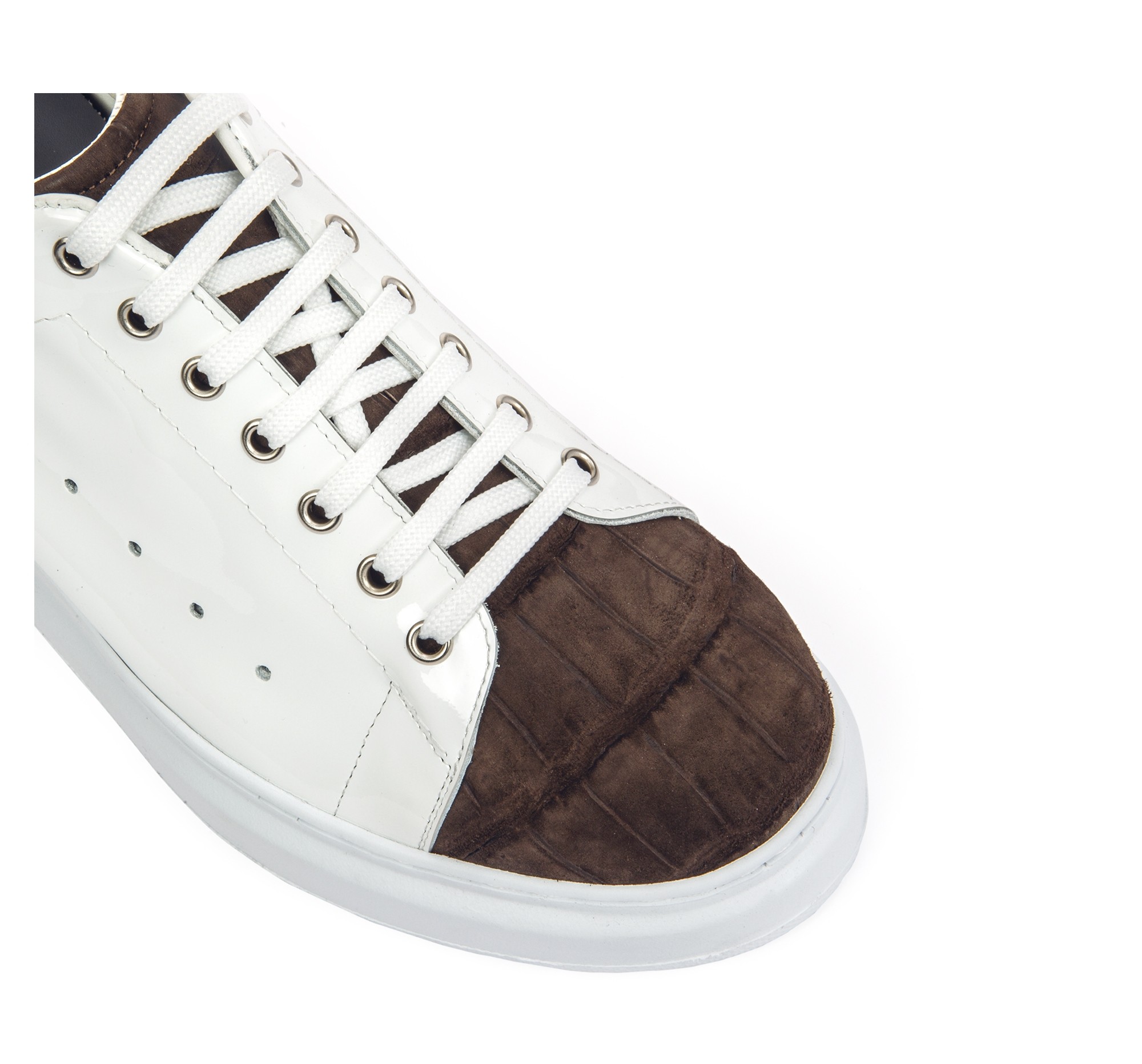 Elevator sneakers with upper in white patent leather and details in brown nabuk crocodile leather on the toe, tongue and heel tab.