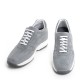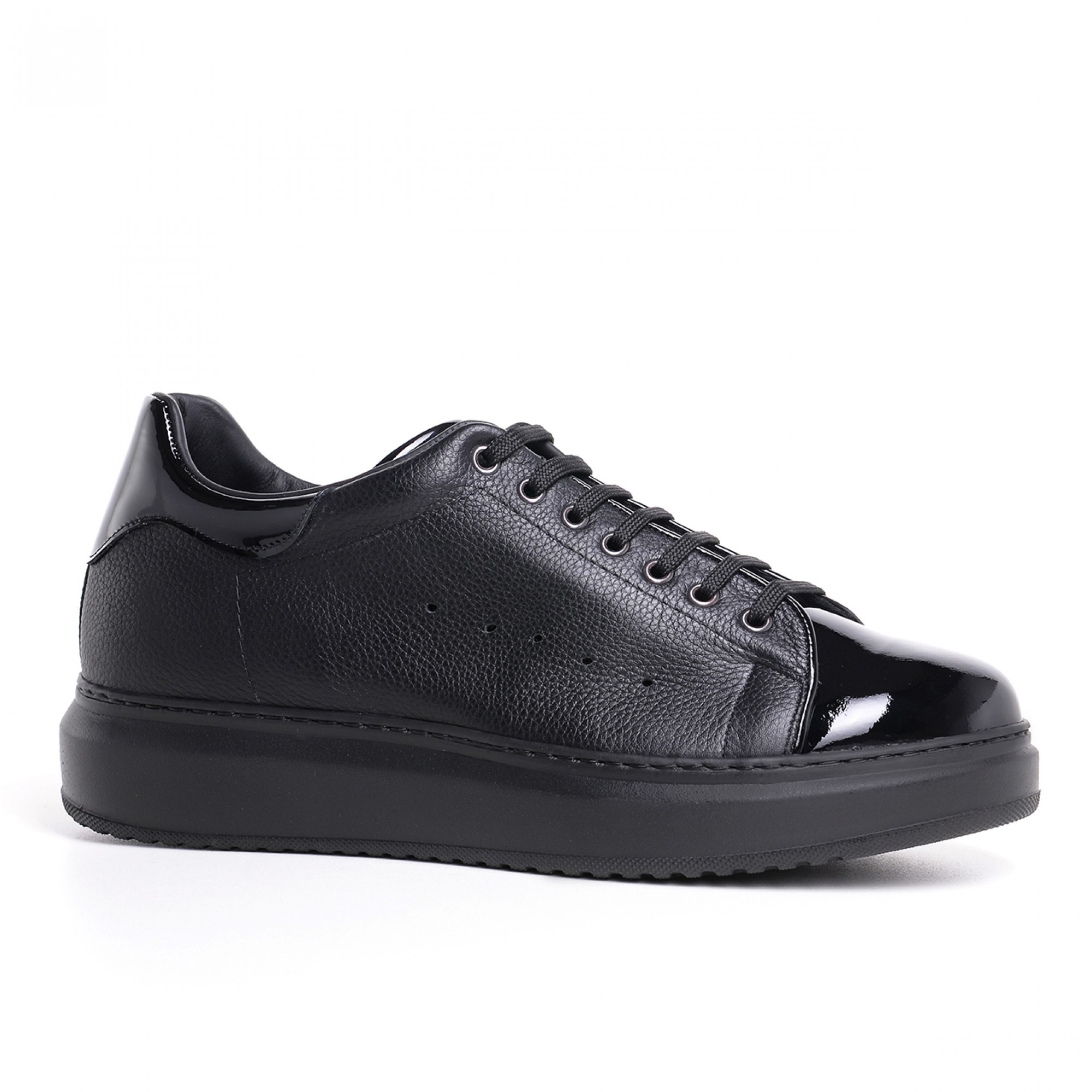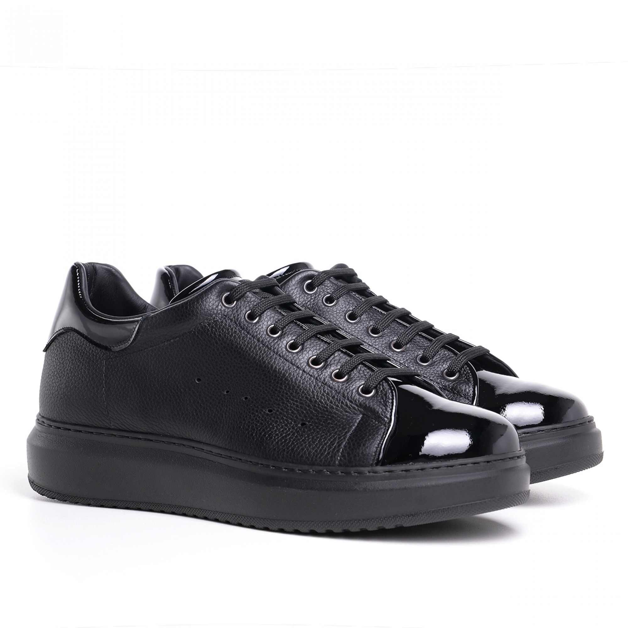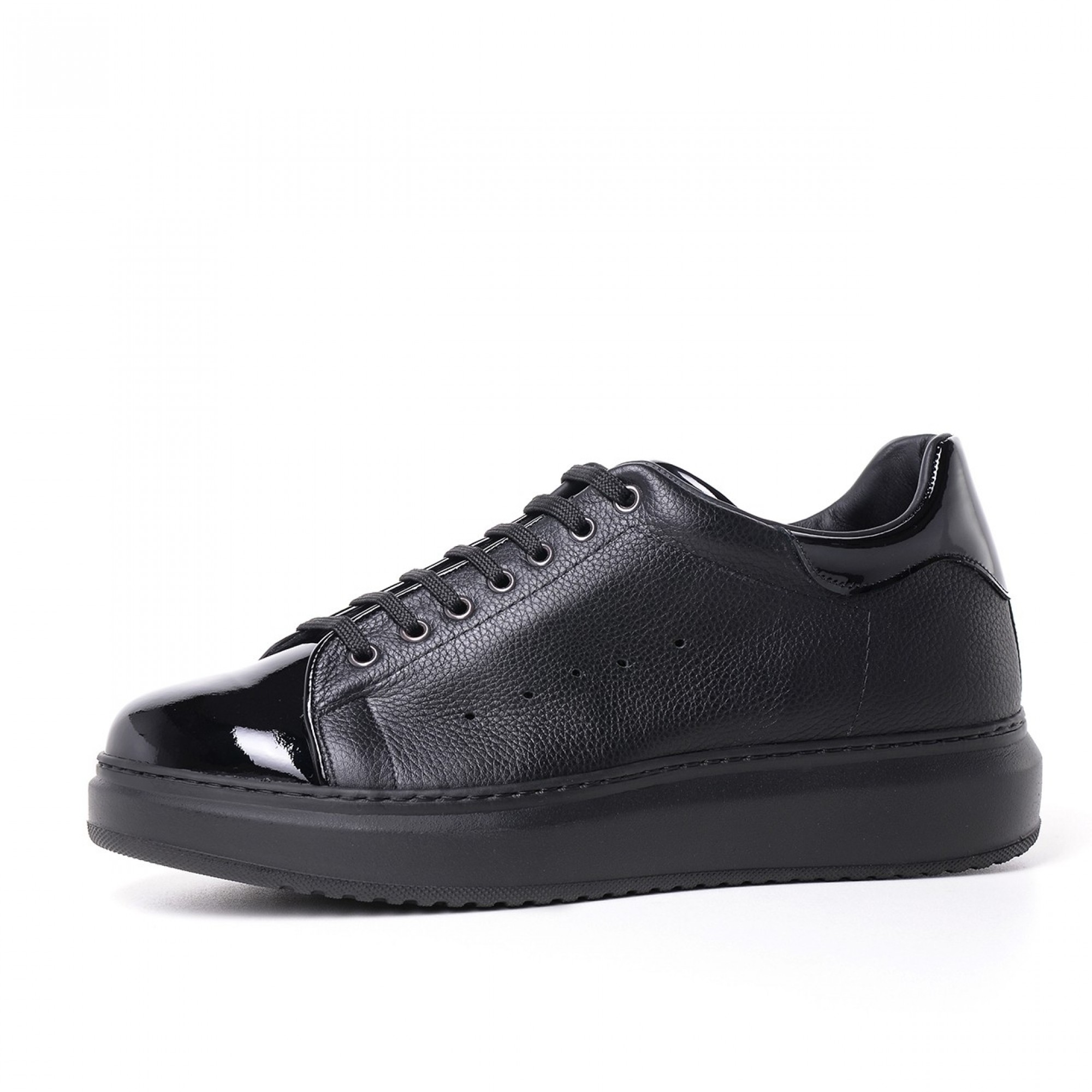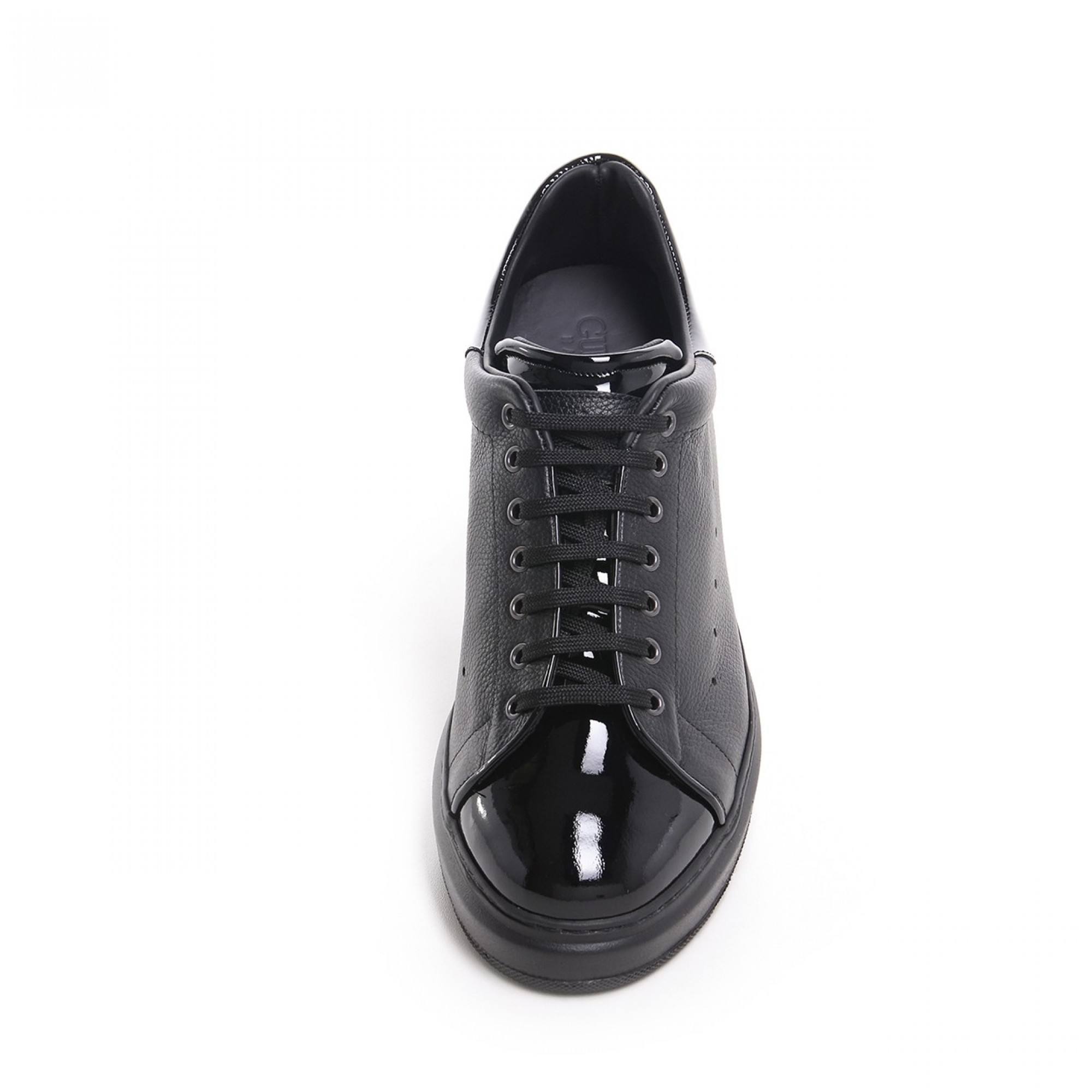 Sneakers able to increase height from 2.4 (6 cm) up to 3.1 inches (8 cm), featuring a particular upper in hammered calfskin, handcrafted and embellished with patent leather details on the cap toe and heel tab for a refined sleek effect.