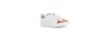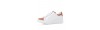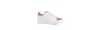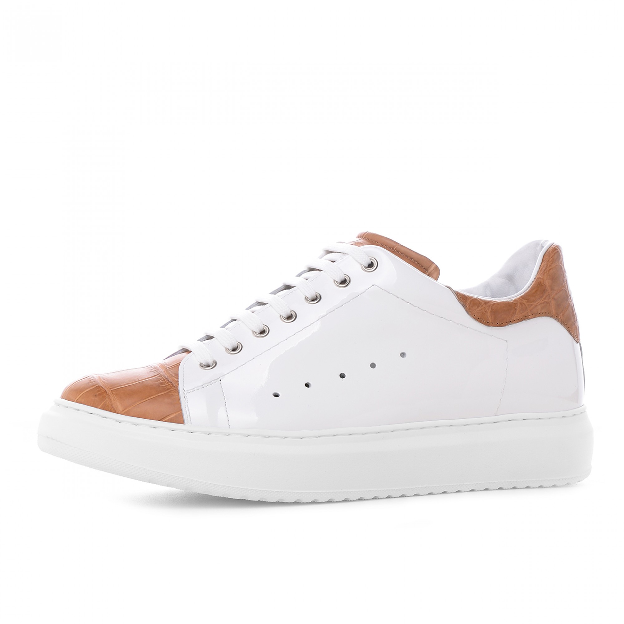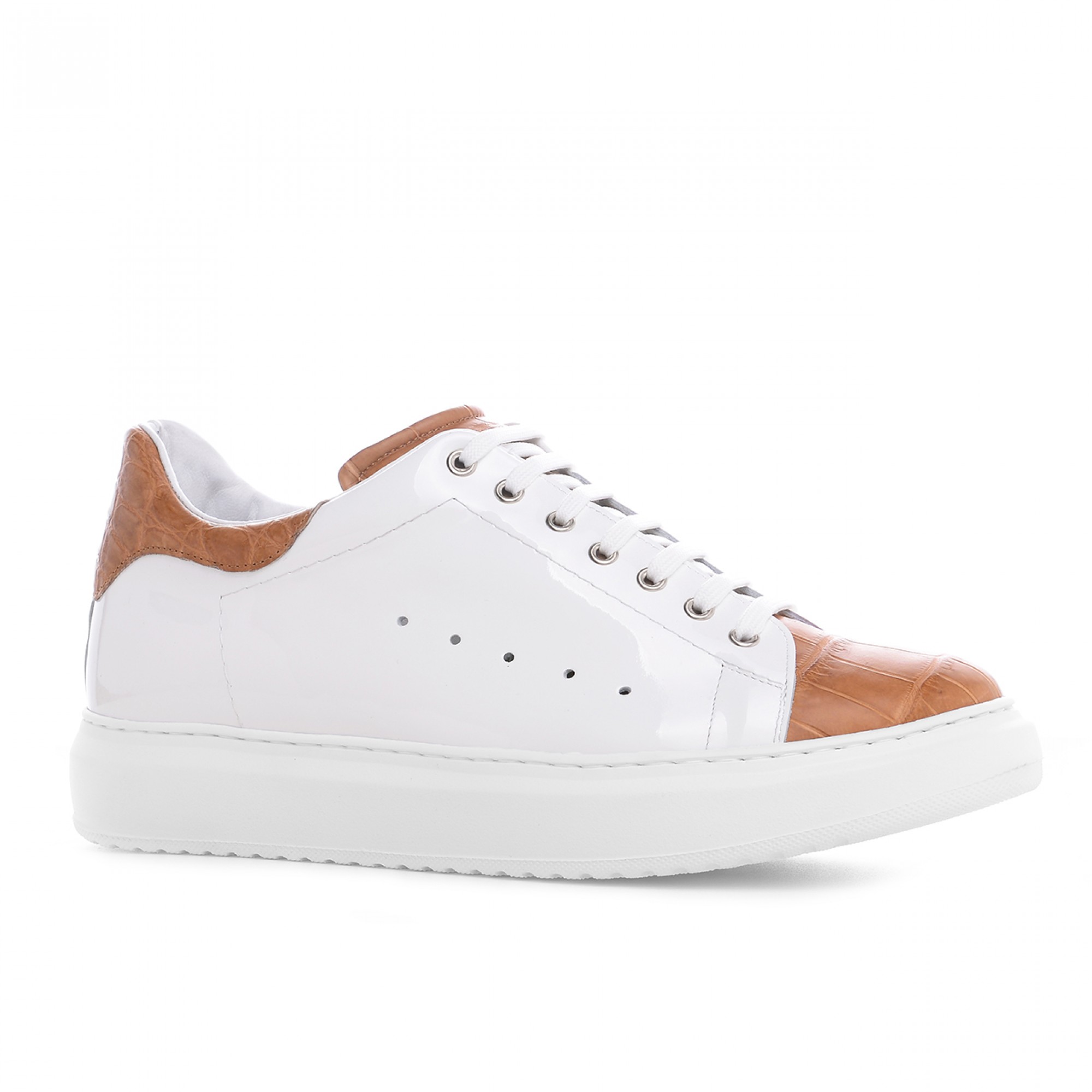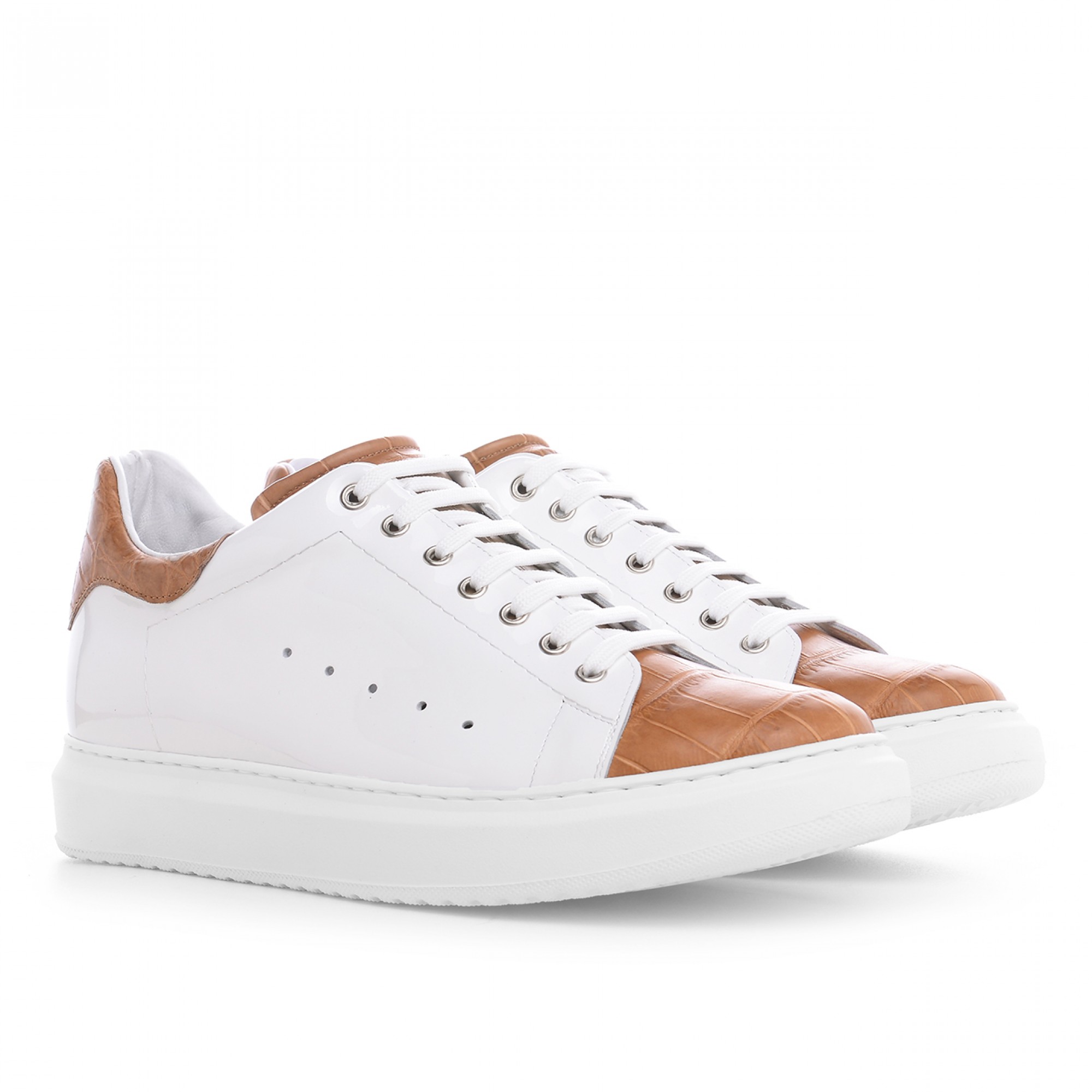 Luxury handcrafted sneaker with upper in white patent leather and details in genuine brown crocodile leather skin on the tongue, toe and heel tab.