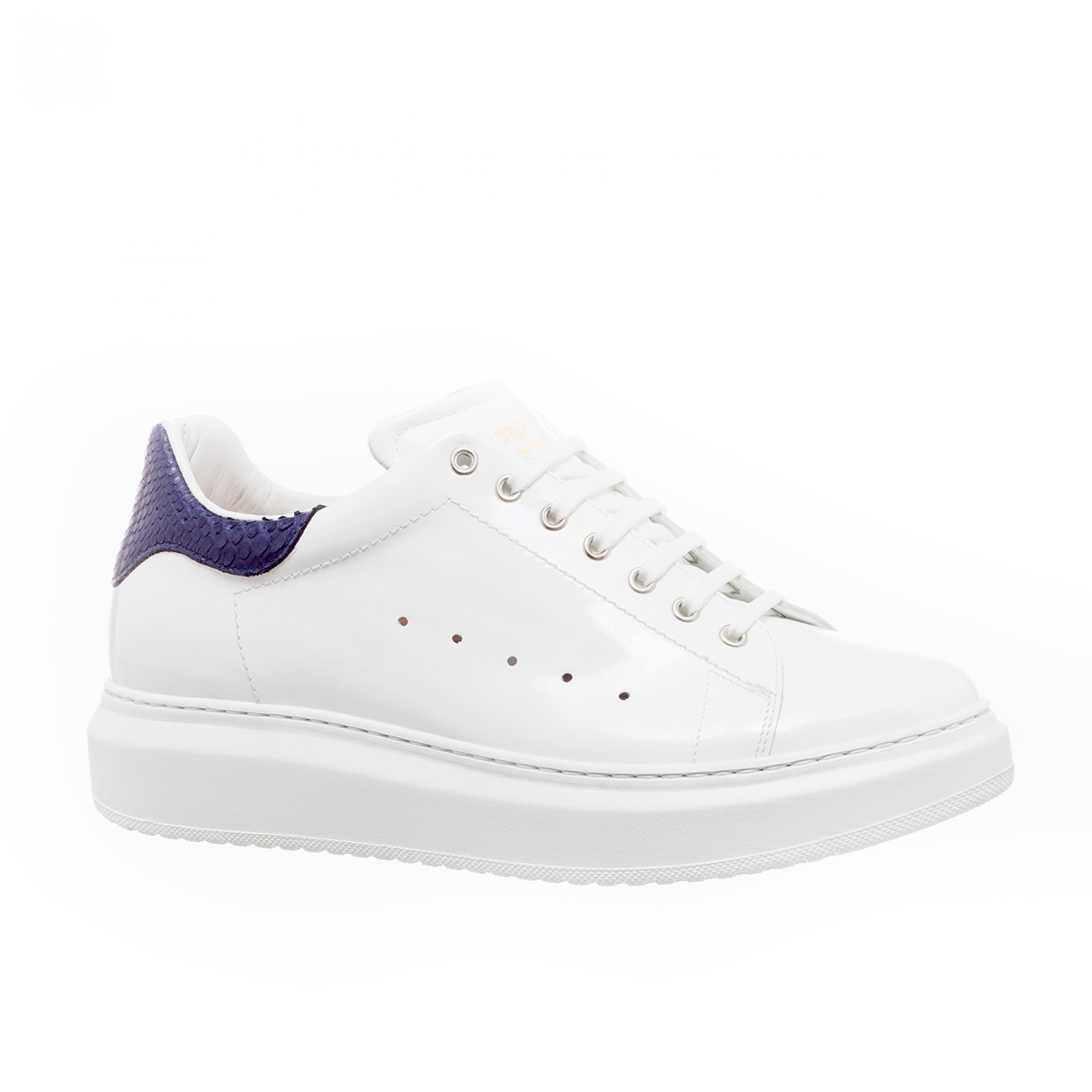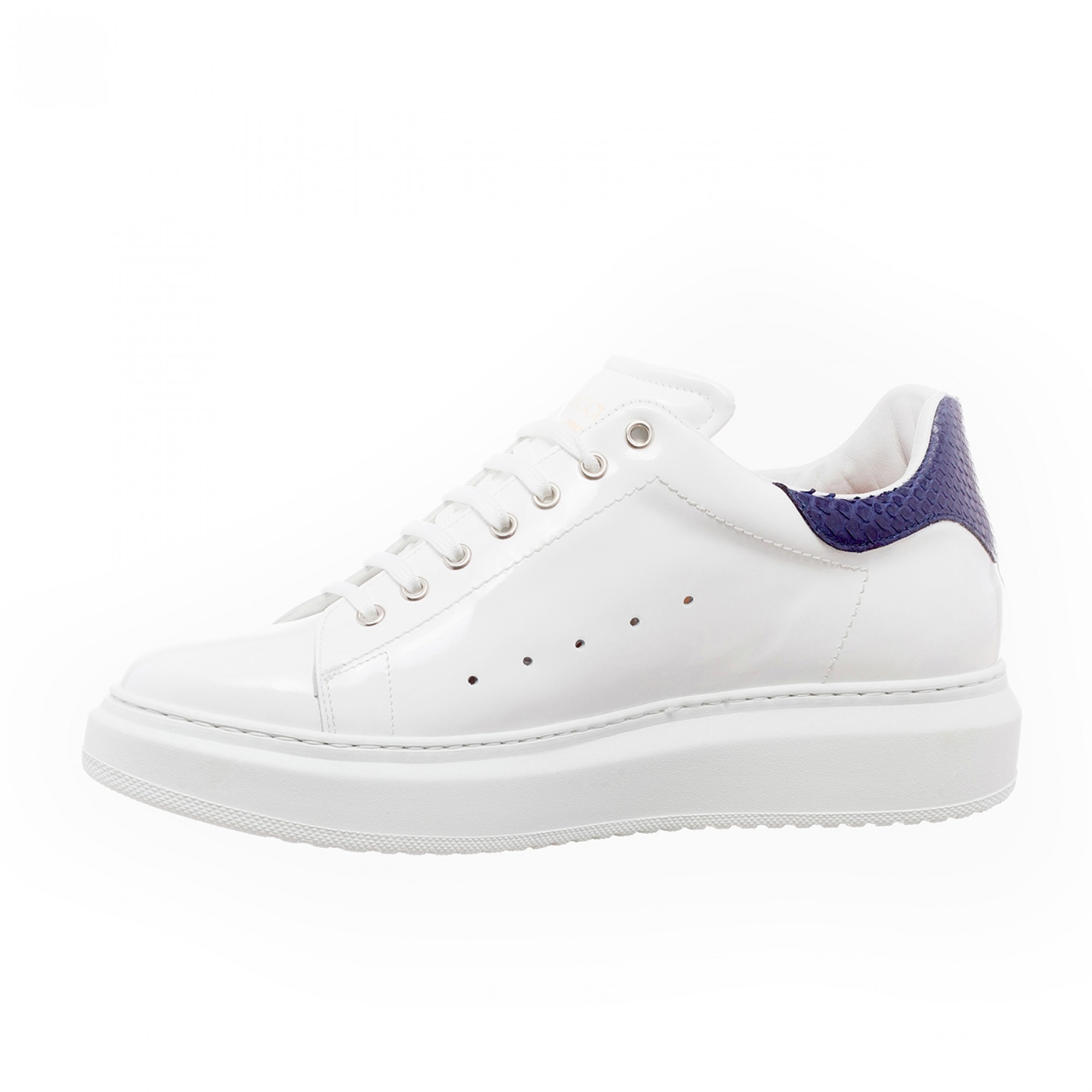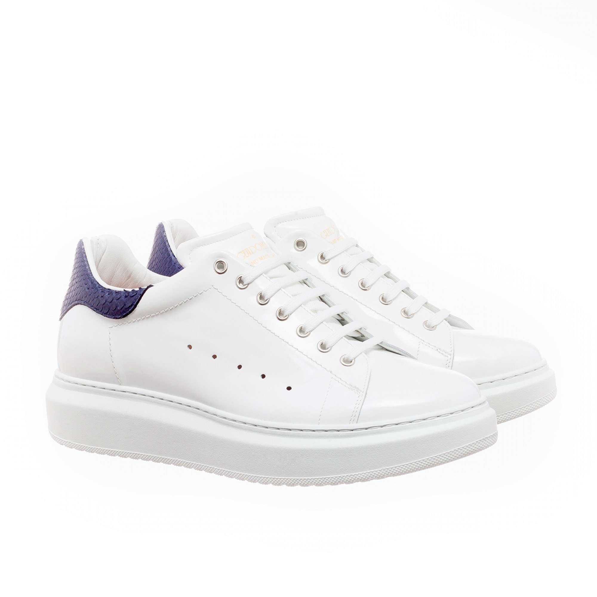 Light and fresh are the new "Tasmania" sneakers by GuidoMaggi. The special upper in white patent leather is enhanced with fine elements in blue shades genuine python skin, handmade in Italy. The inner lining of soft goatskin also ensures maximum comfort and the correct posture.The outsole in lightweight high quality anti-slip rubber and the insole in genuine Italian leather are completely handmade.