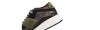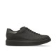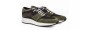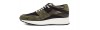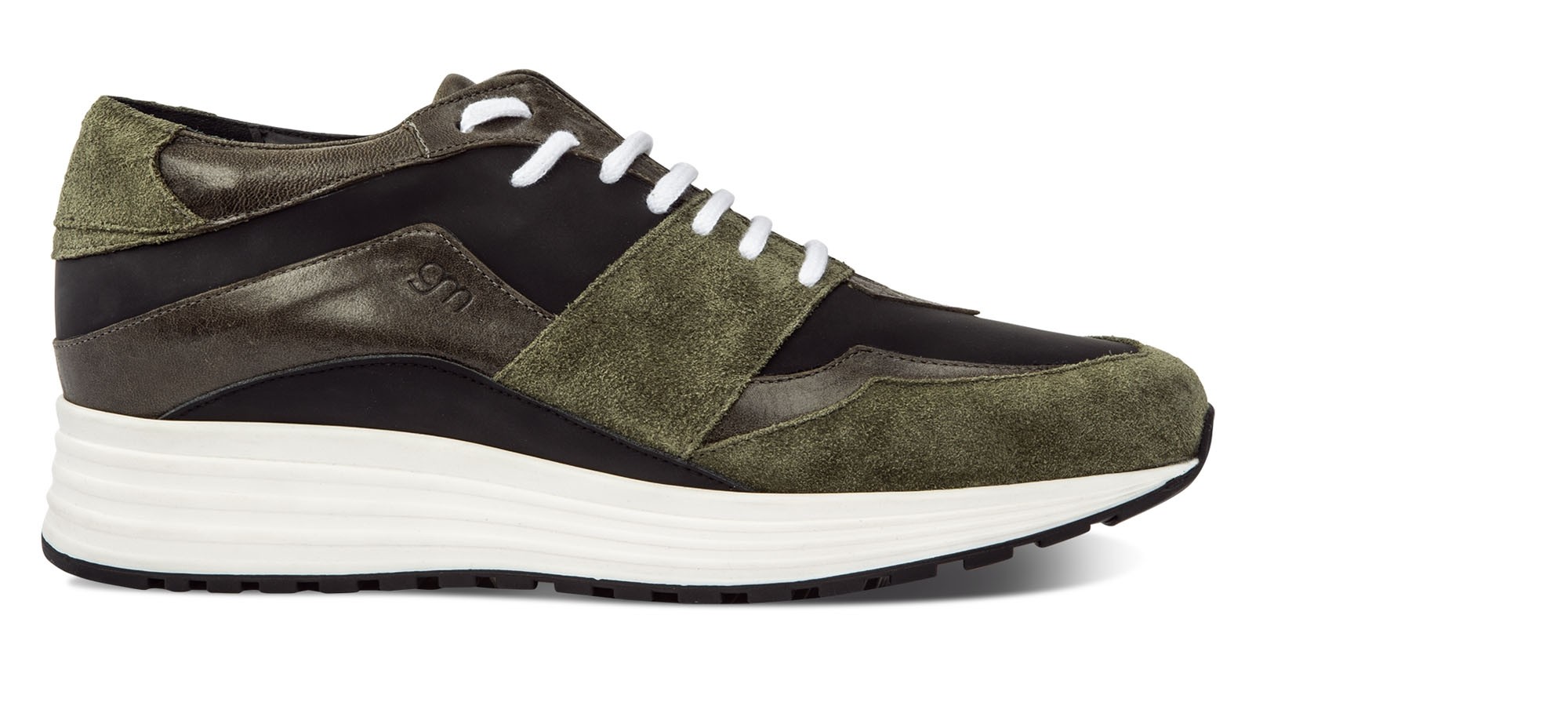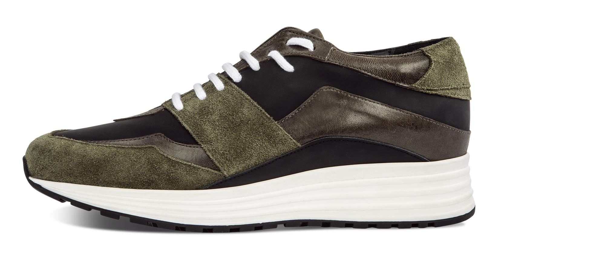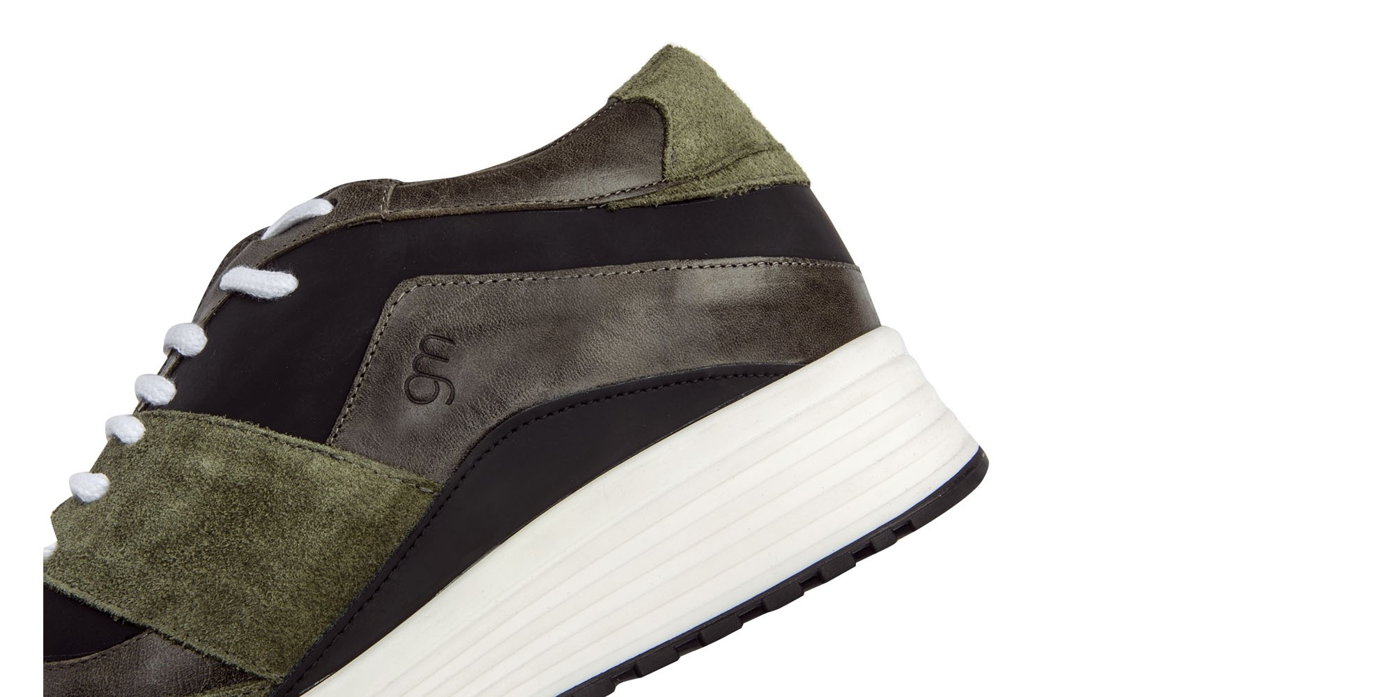 Luxury sporty elevator sneakers inspired by the iconic models of the 70s made of black rubberized calf leather, semi shiny gray calfskin featuring a leather used effect and dark green suede. The new white striped sole is made of ultra-light rubber.