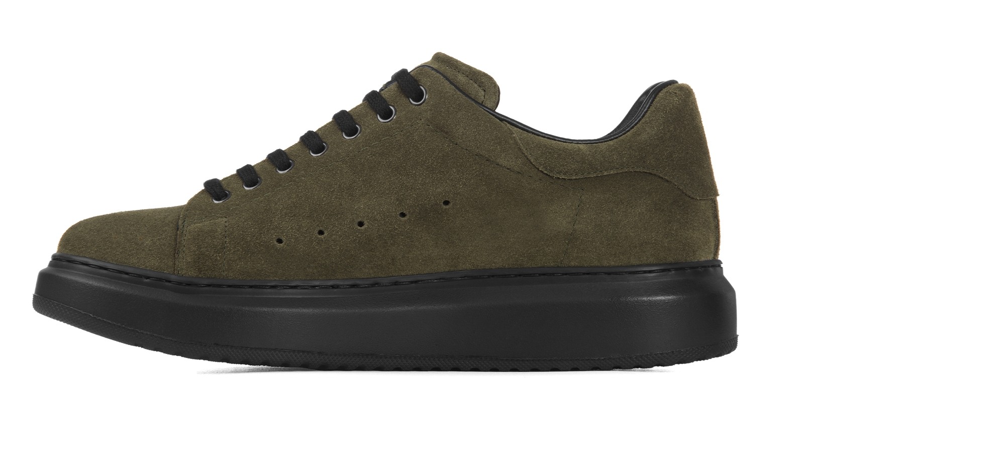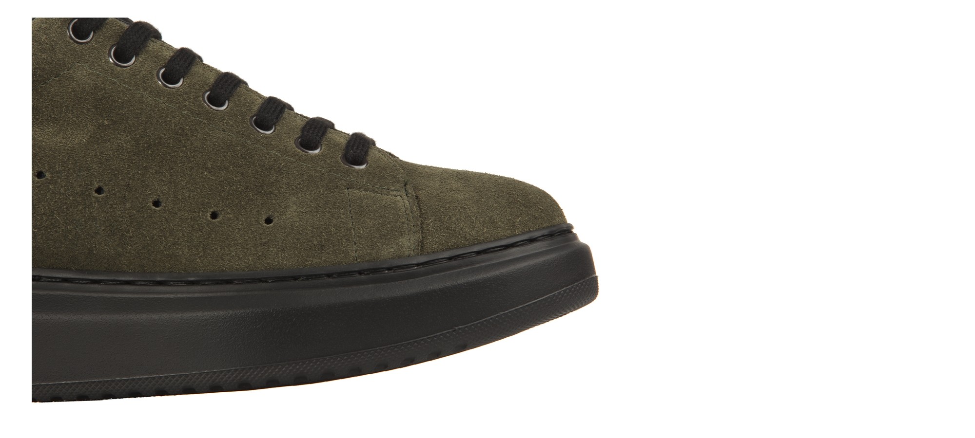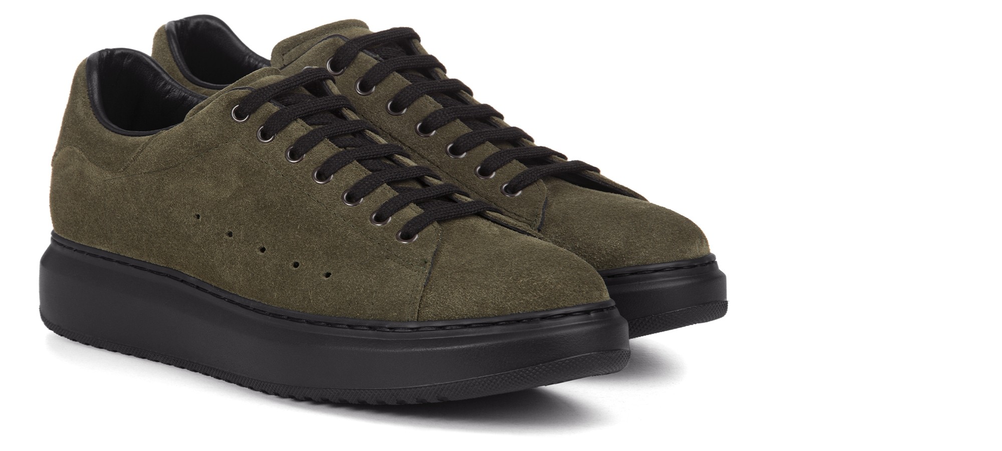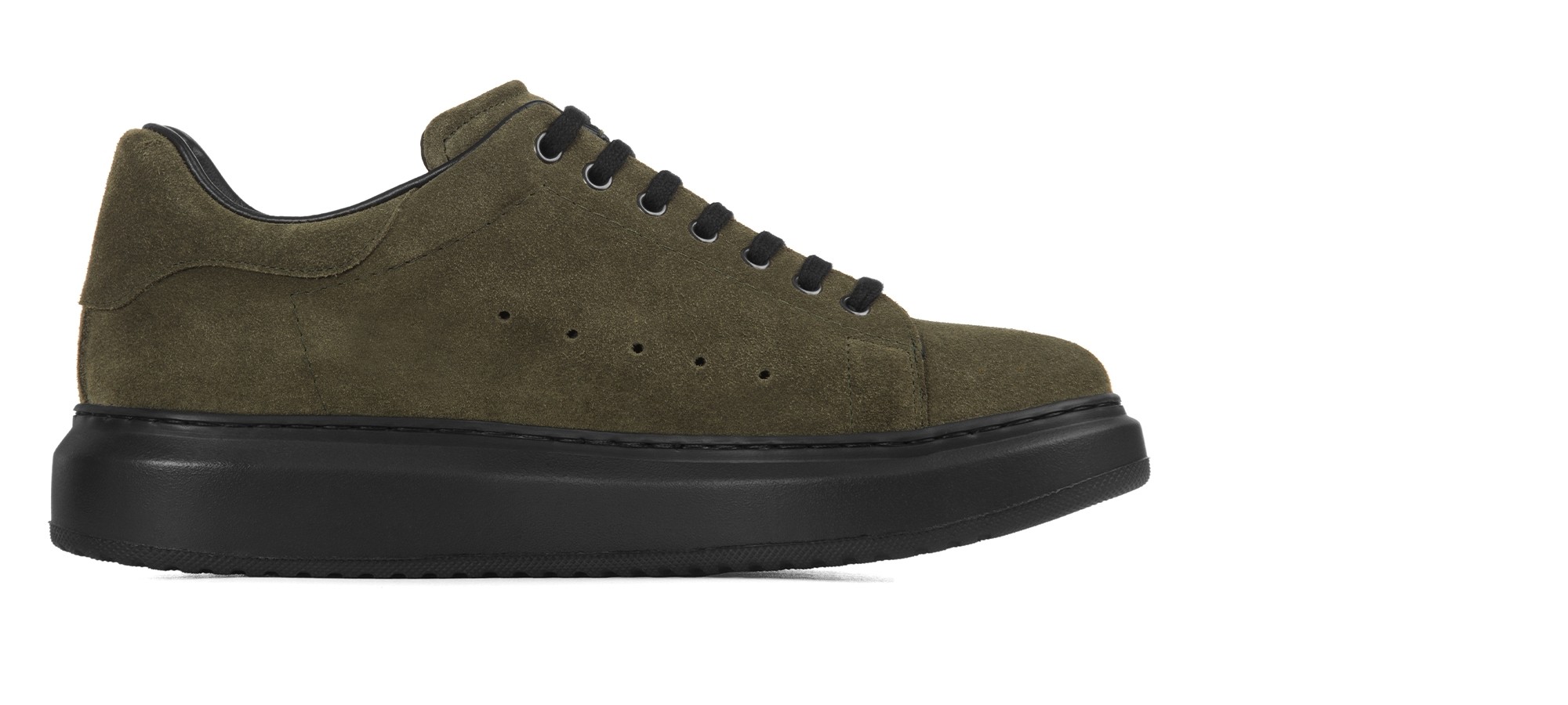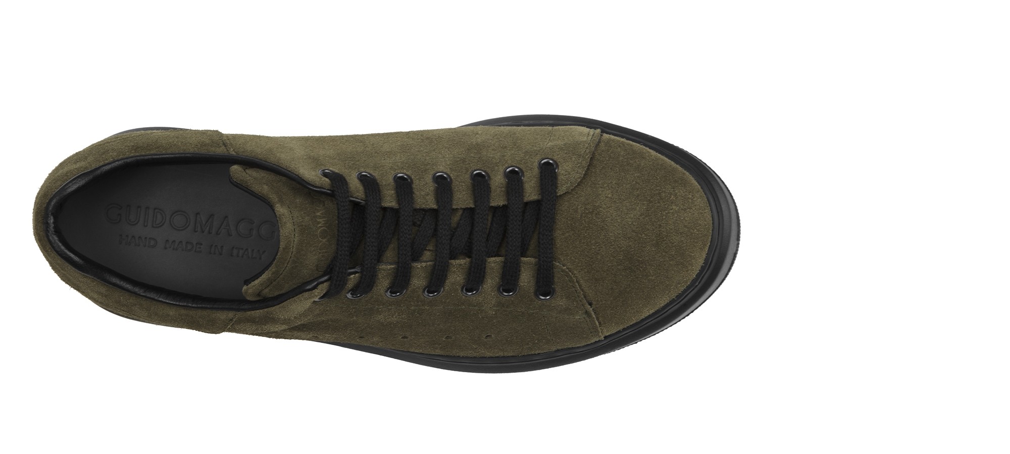 Elevator sneaker with soft lines and a contemporary design. The upper is in super soft suede leather, in the captivating military green nuance. The laces and light rubber sole are in black.