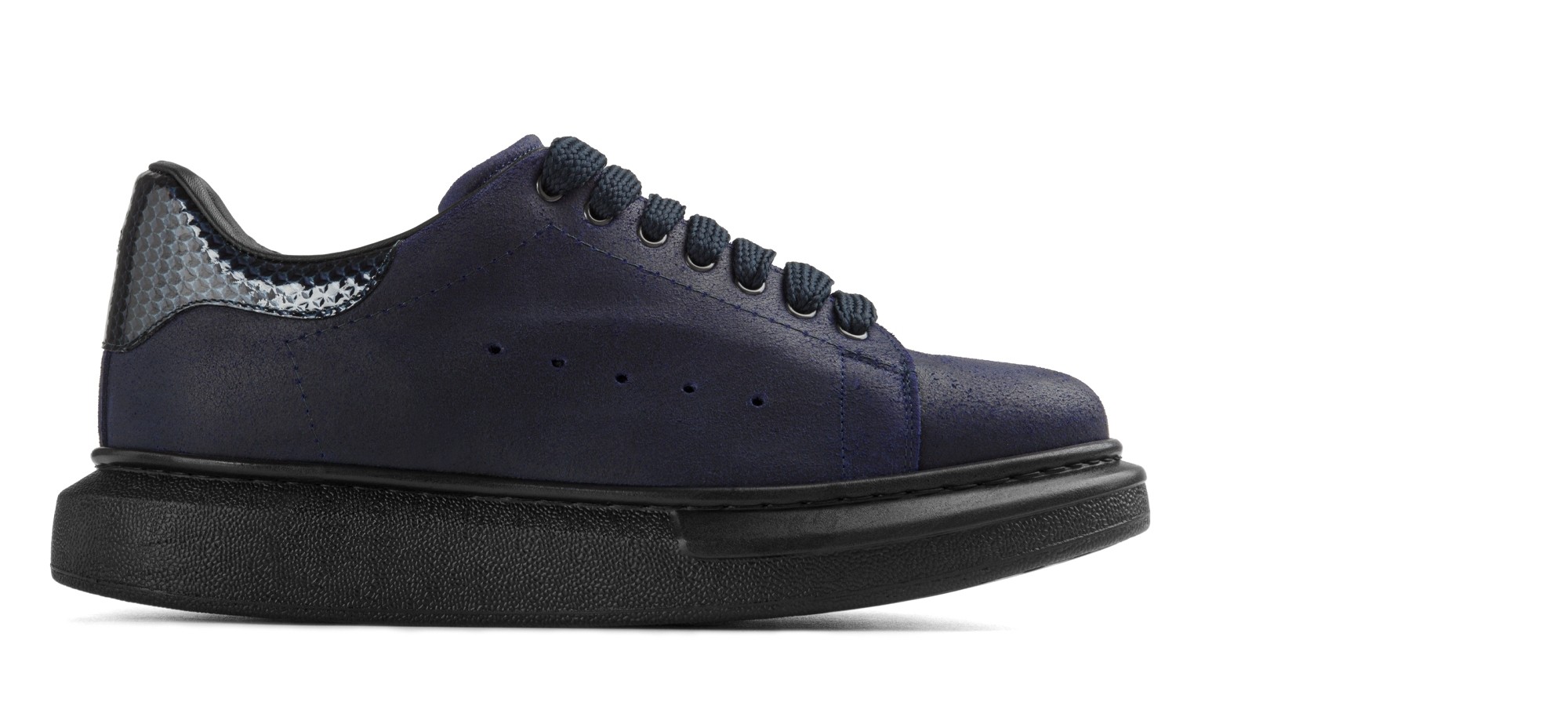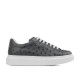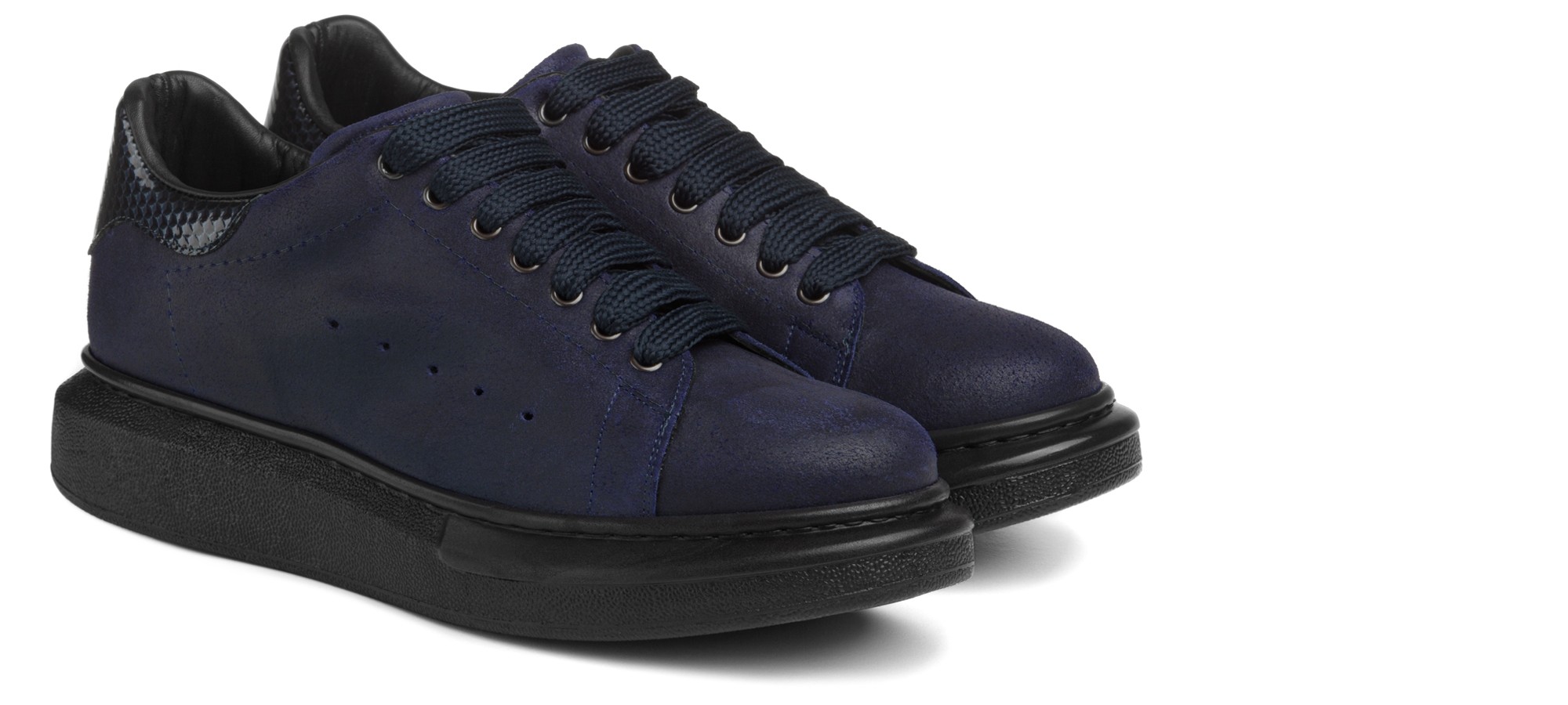 Sneakers with rounded lines, comfortable and snappy. Perfect for casual looks, but always with style. The upper is in soft calfskin with an attractive waxed effect and blue patent heel tab with diamond effect.