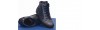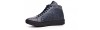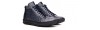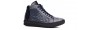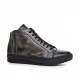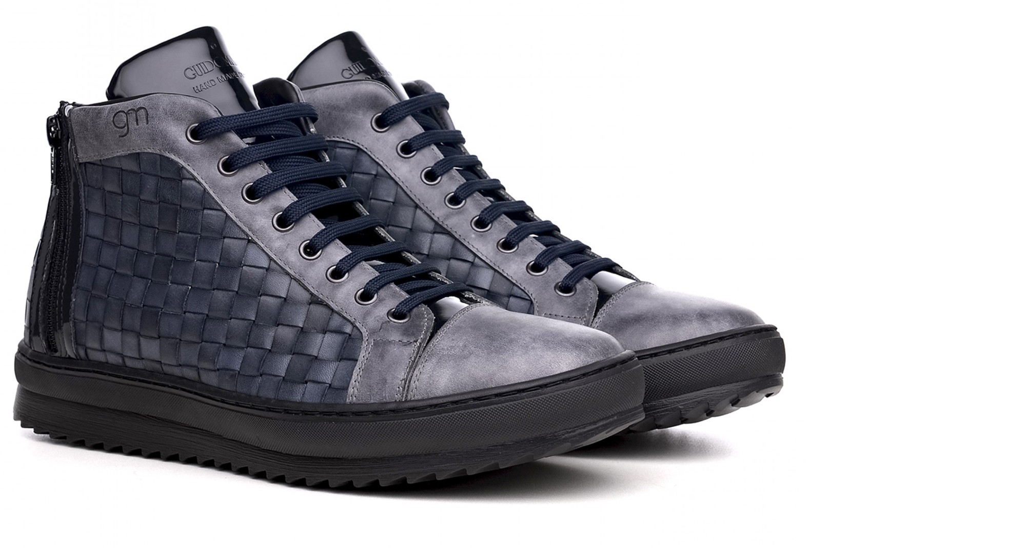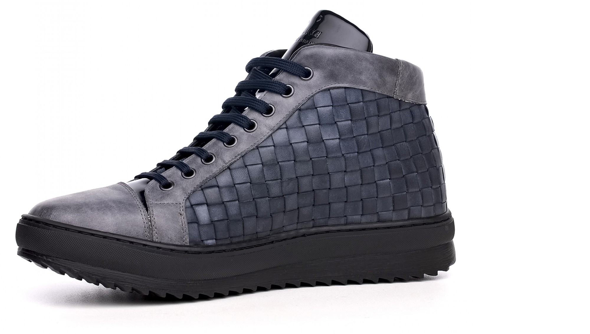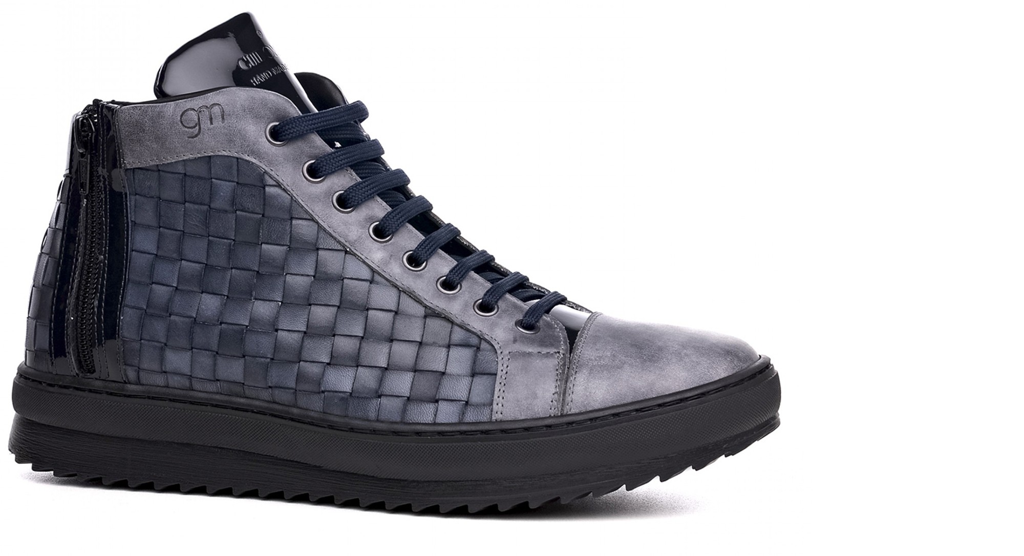 Mid-top elevator sneakers with upper made of three precious leathers: speckled gray calf leather, dark blue patent leather adorning the side zip and tongue, hand-painted braided leather with blue shades on the sides. The black sole is made of natural rubber.