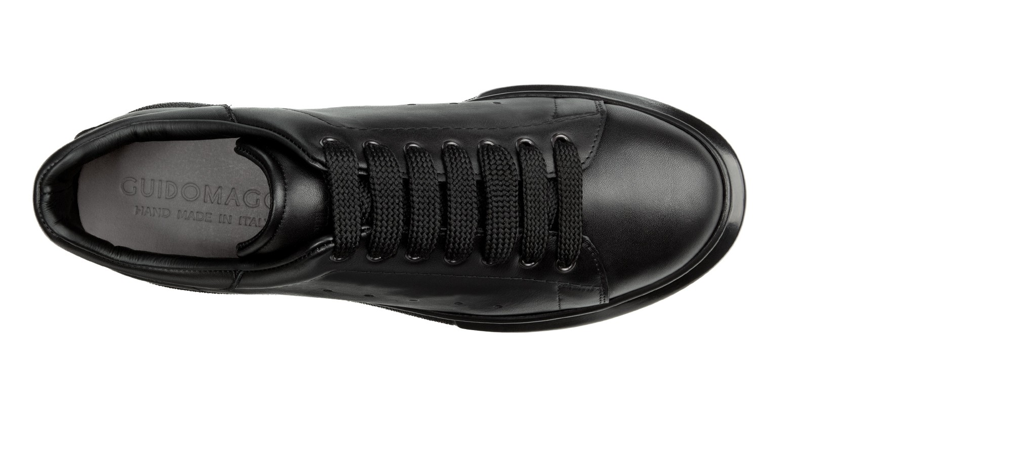 Sporty chic: total black elevator sneakers, new edition by GuidoMaggi. With an upper in black full-grain calfskin and a super light rubber sole, it is all black with a shiny effect. It is suitable for all types of outfits, embellishing your style with character and uniqueness. Up to 8 centimeters more height. Handmade in Italy