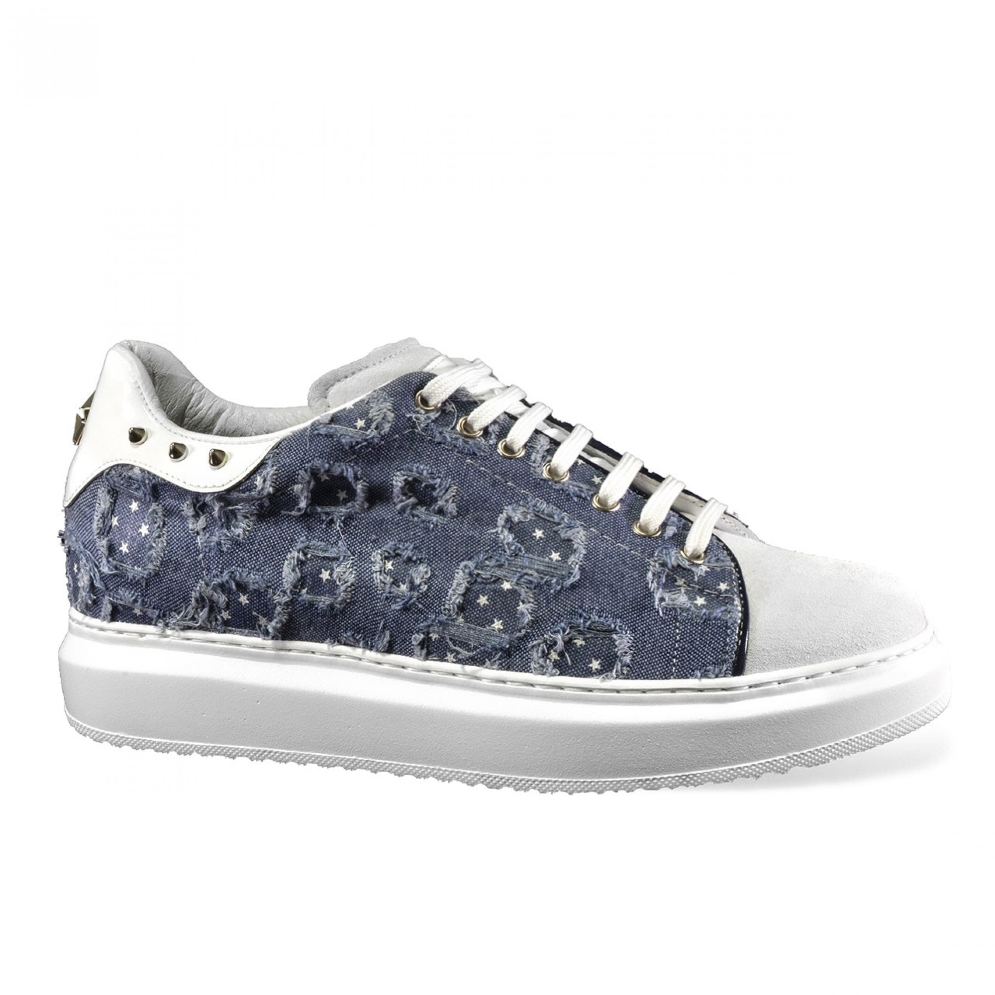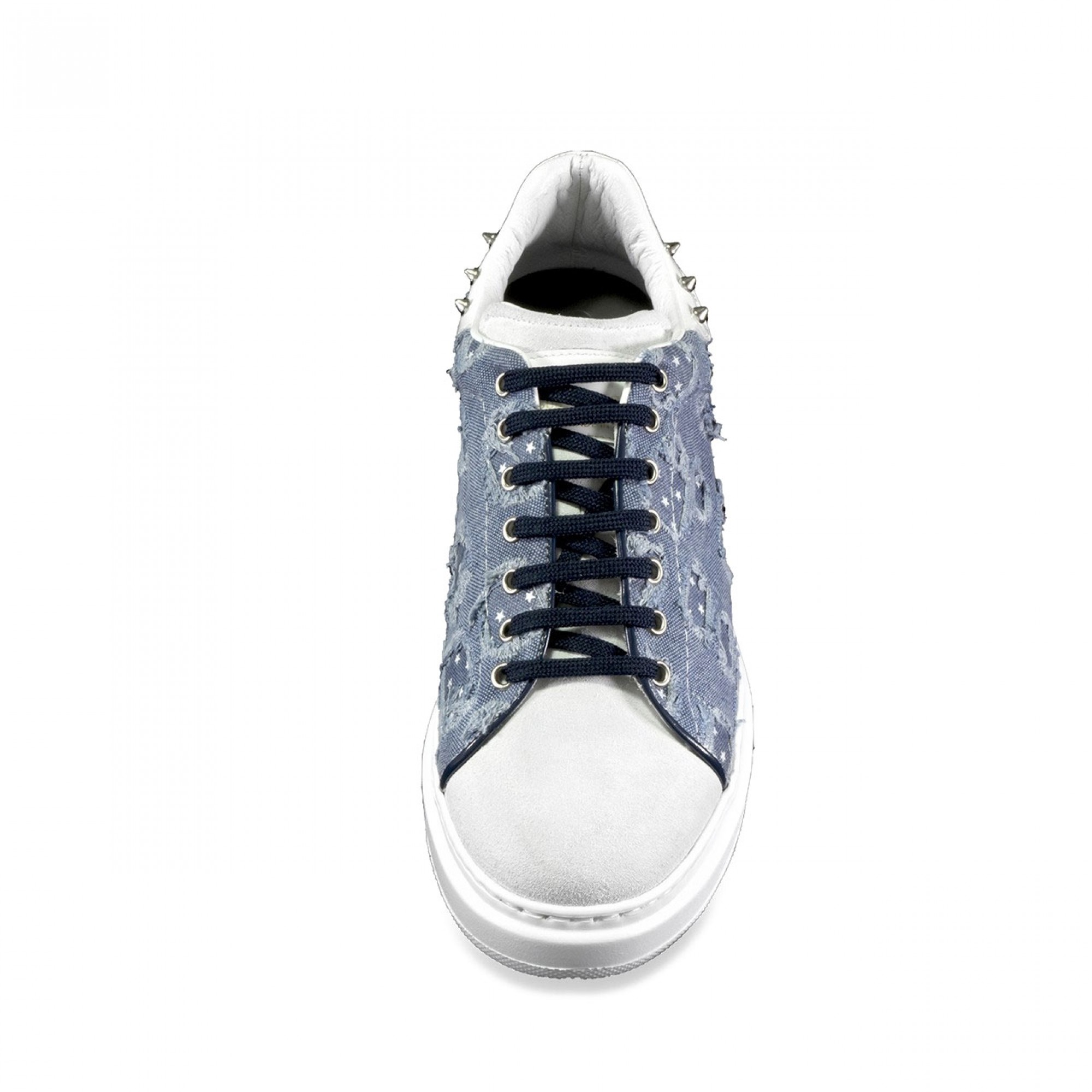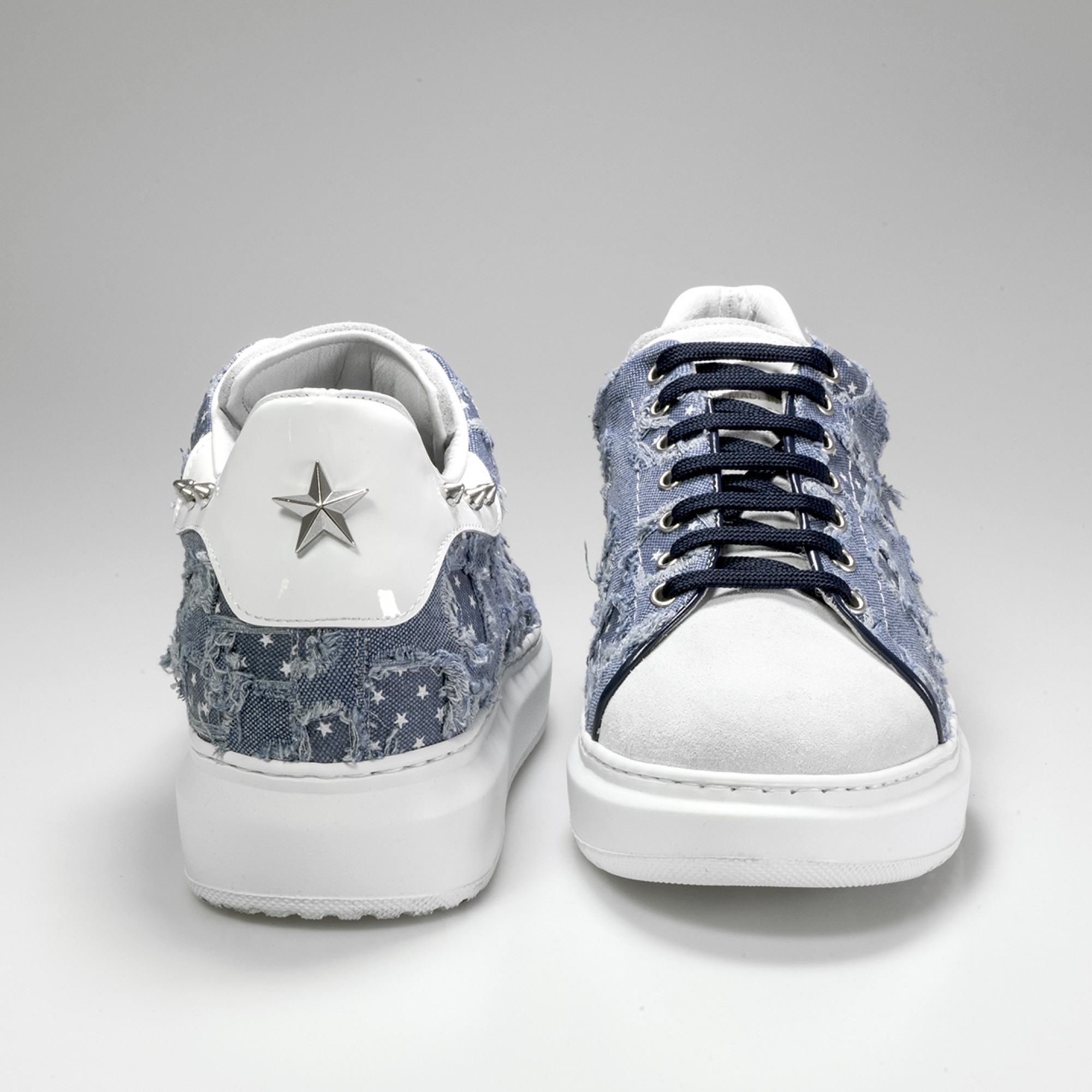 Super trendy sneakers able to add from 2.4 inches (6 cm) up to 3.1 inches (8 cm) to your height, with denim upper, grey suede toe cap and white patent heel tab decorated with studs and silver star.