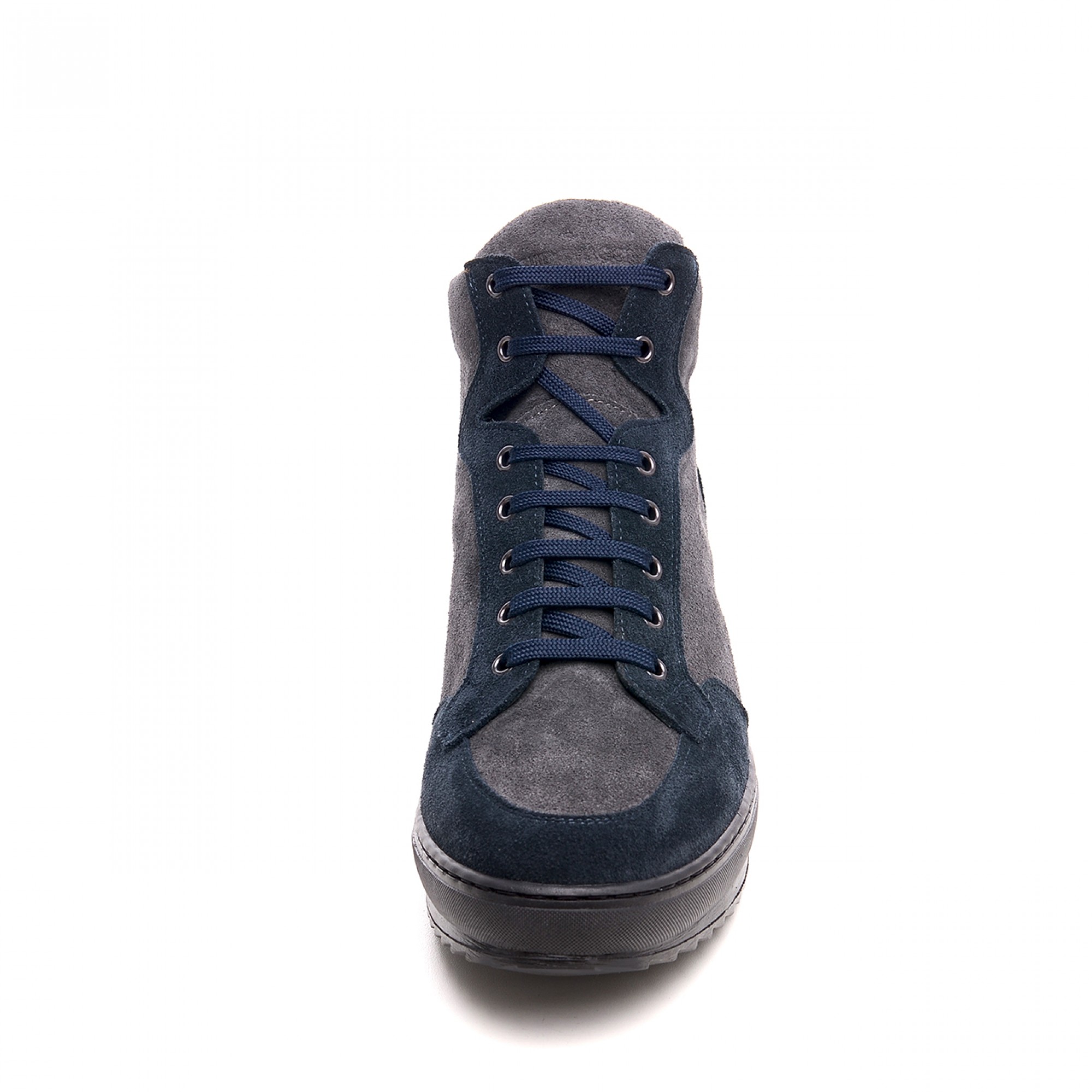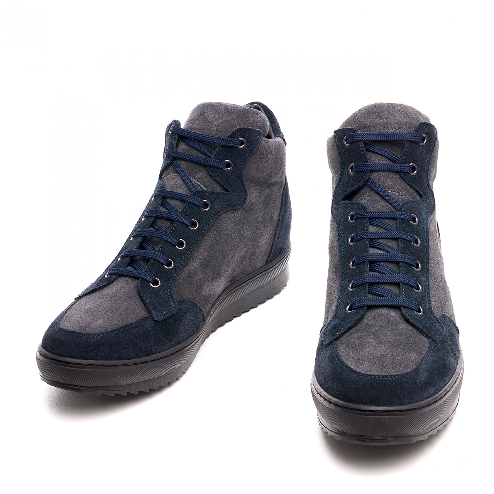 Handcrafted high-top elevator sneakers with two-tone upper in dark blue and gray suede and black super-light sole in natural rubber.