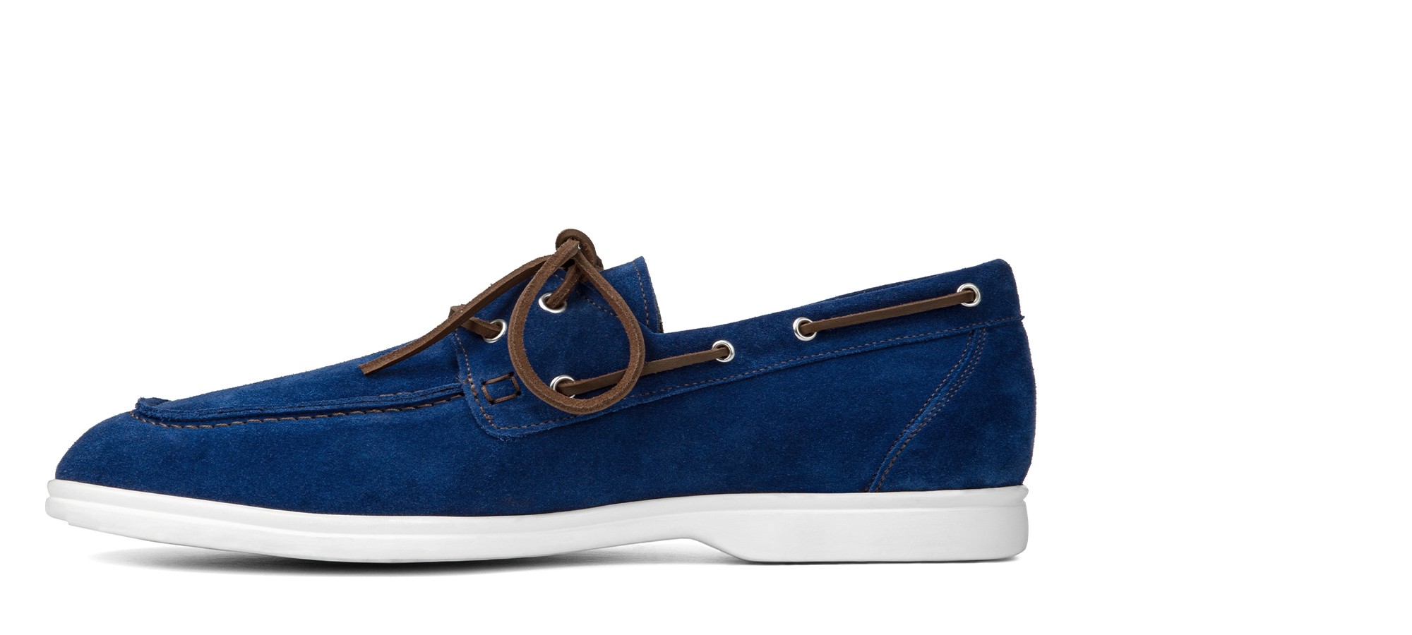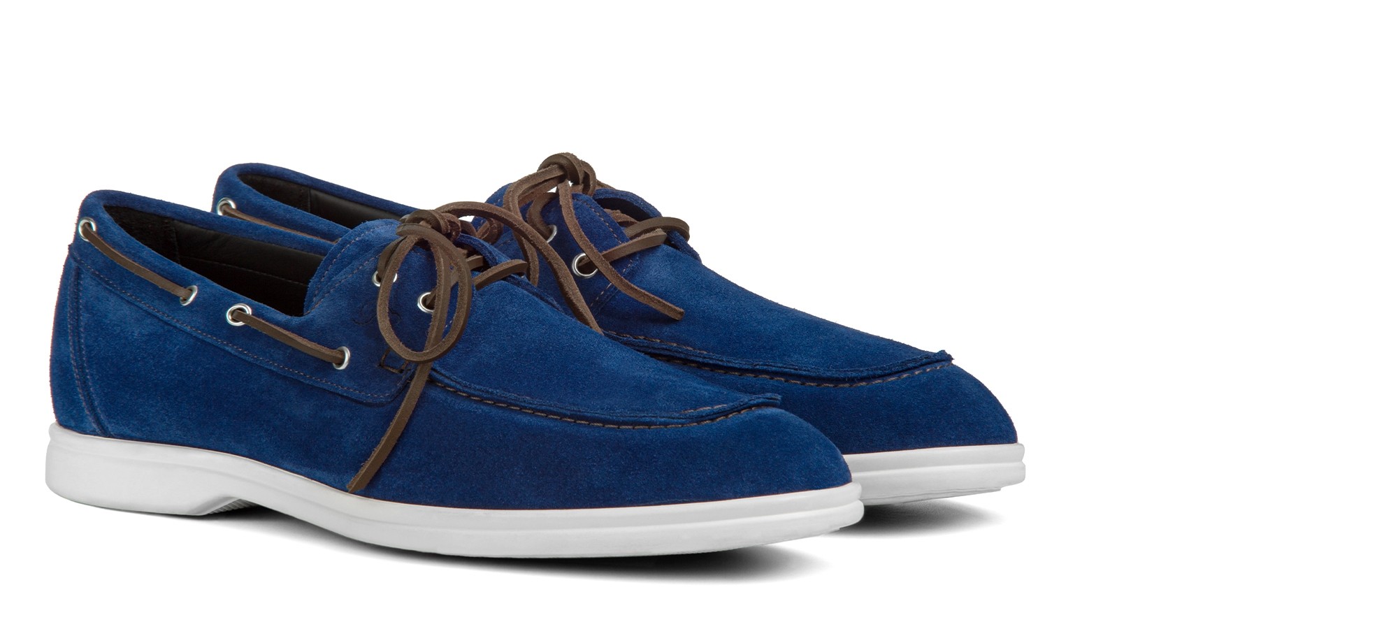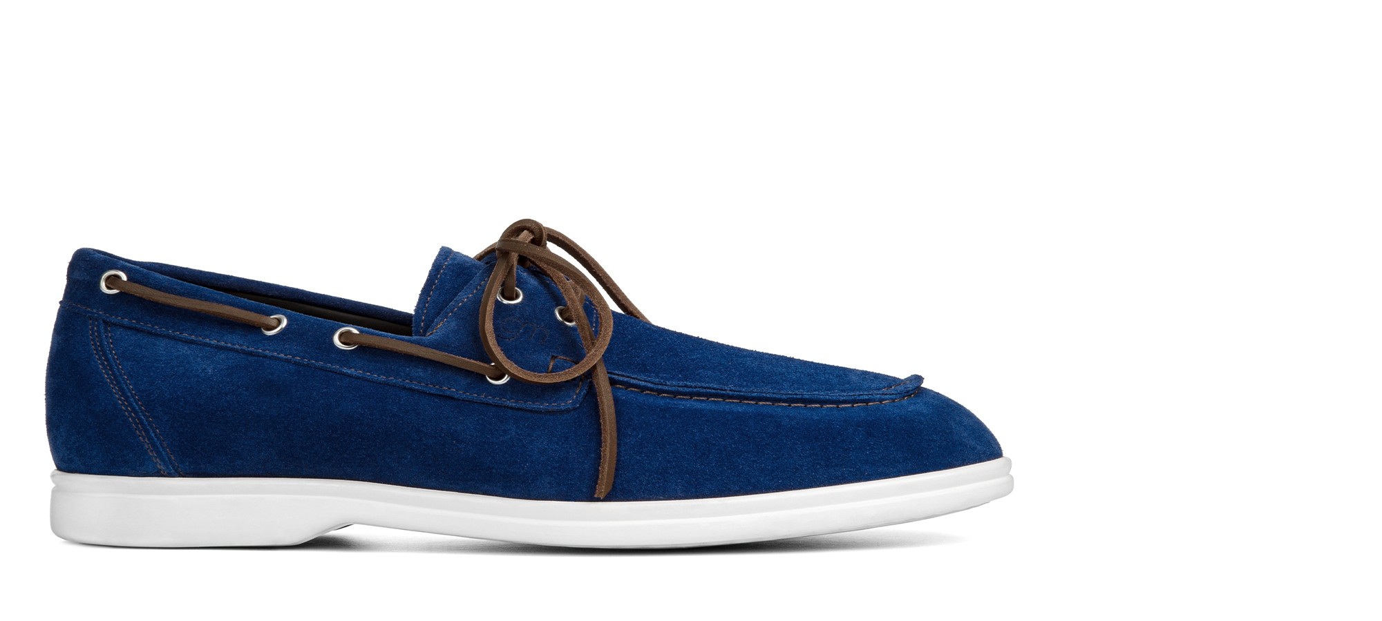 A modern take on the classic boat loafer, this casual model is crafted from soft blue suede, featuring laces and two front eyelets for a secure fit. Stylish and versatile, it’s perfect for seaside strolls or days on the boat.
