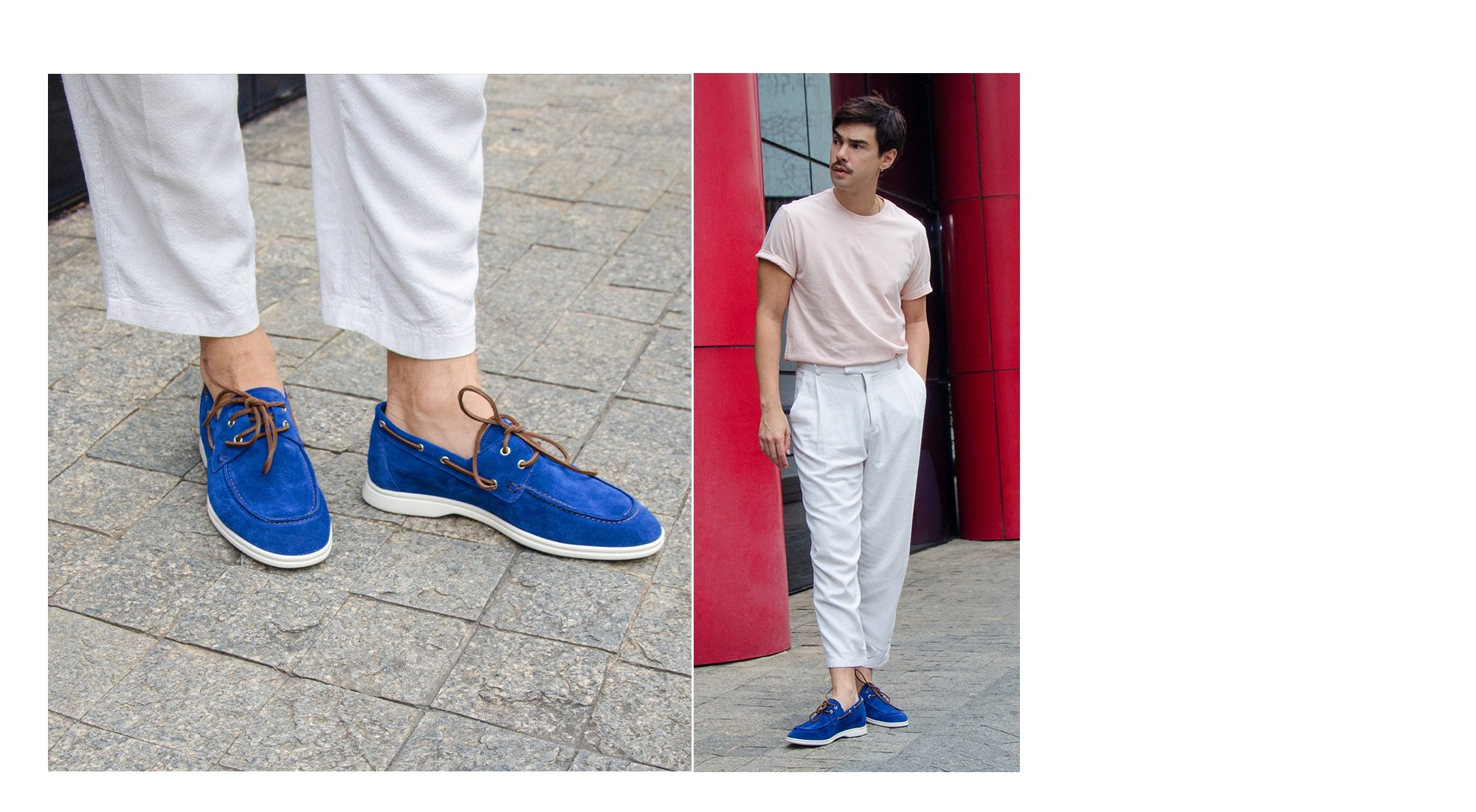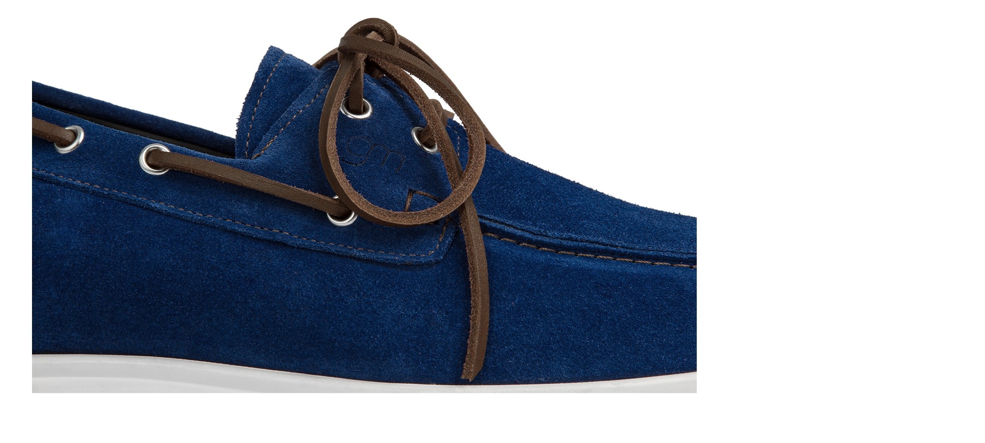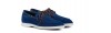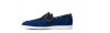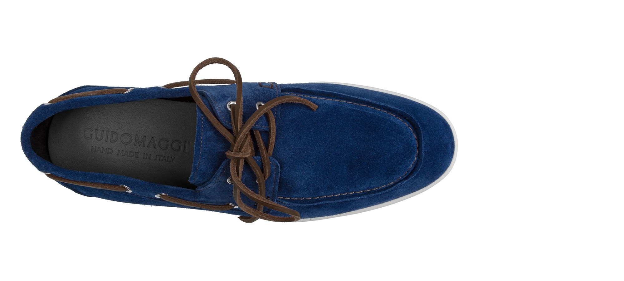 A modern take on the classic boat loafer, this casual model is crafted from soft blue suede, featuring laces and two front eyelets for a secure fit. Stylish and versatile, it’s perfect for seaside strolls or days on the boat.