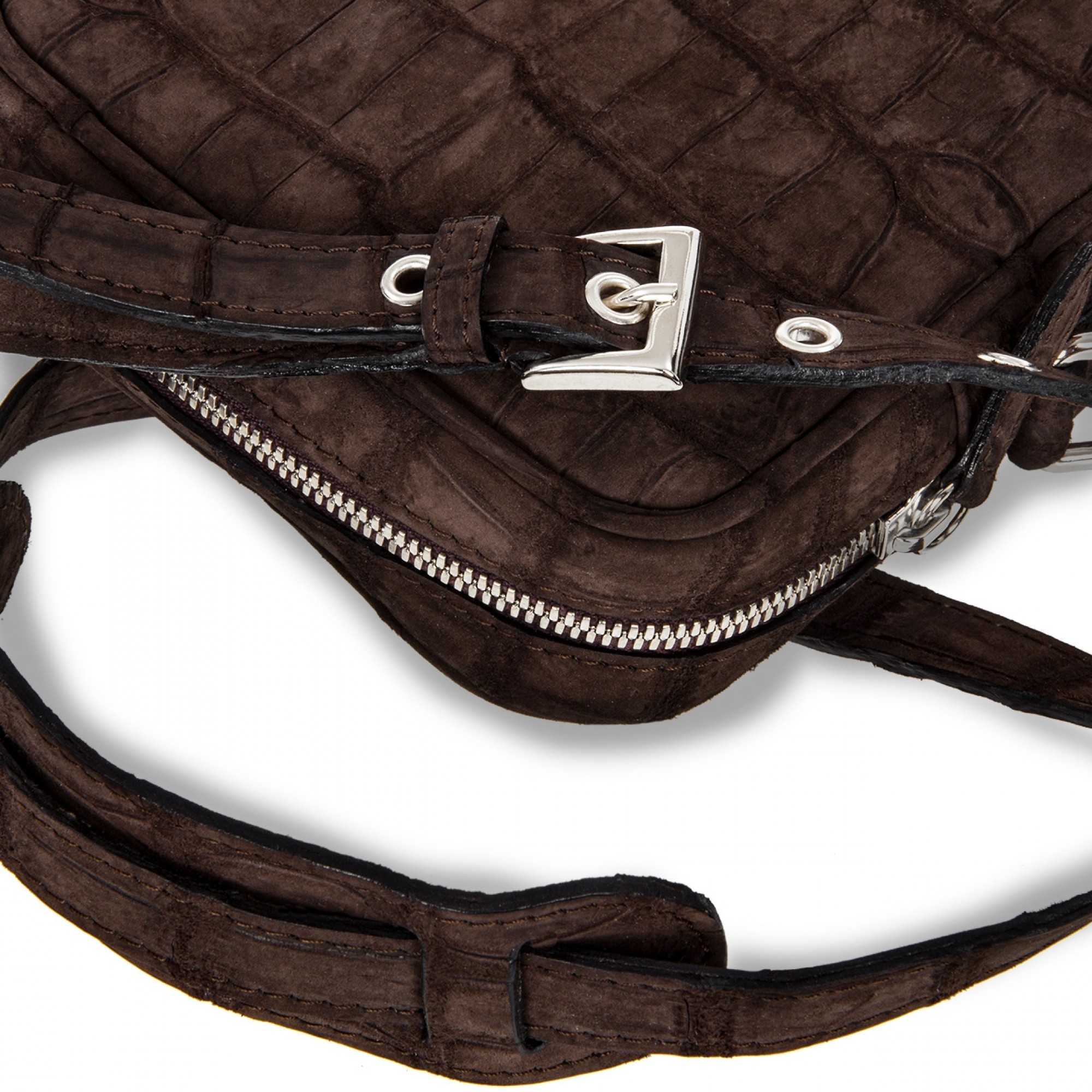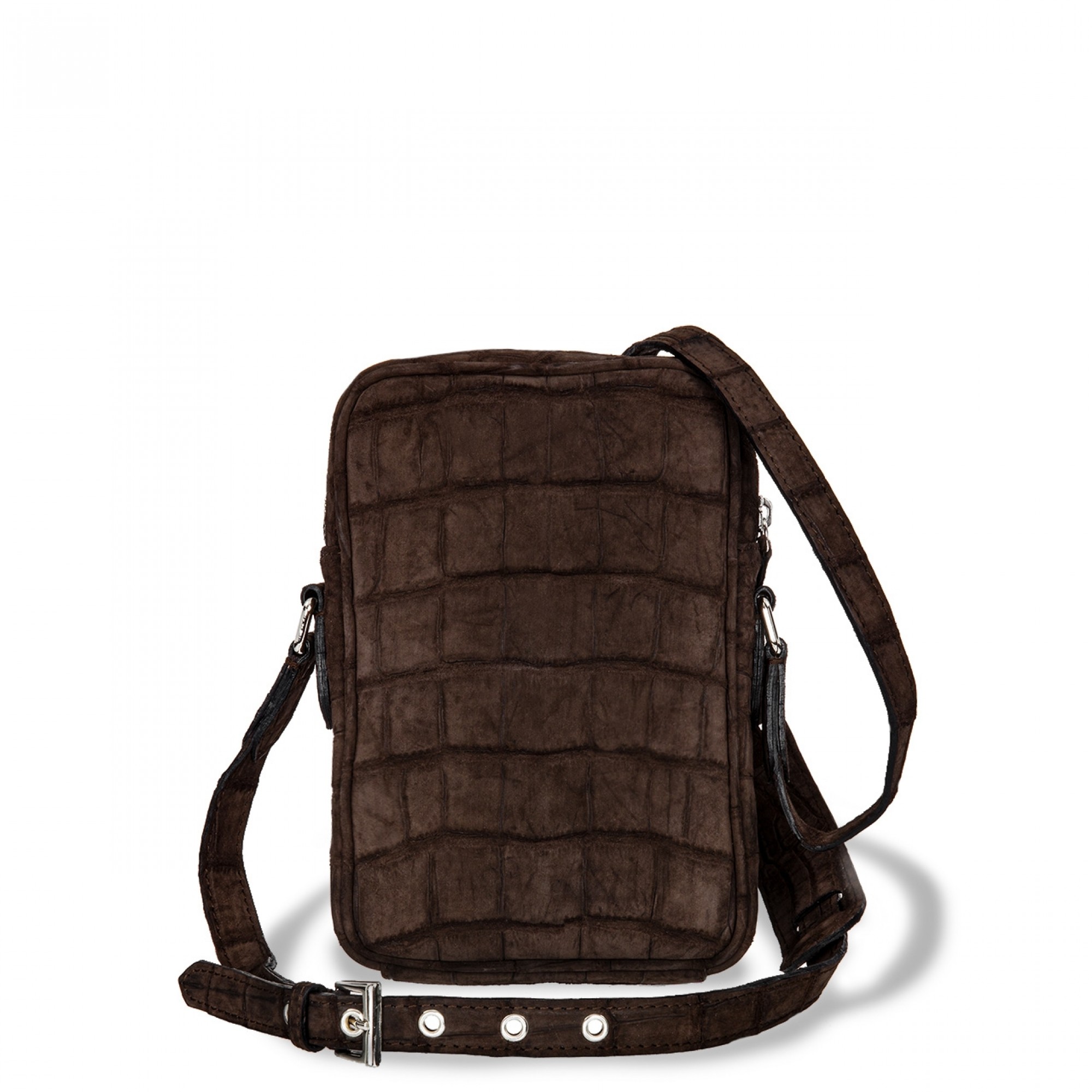 The Centaurus messenger bag by GuidoMaggi is handcrafted in velvety Hermès nubuck crocodile leather featuring an intense brown nuance. Elegant and easy to wear, Centaurus has internal pockets, zip and adjustable shoulder strap. Ideal for everyday use. Handcrafted in Italy. Dimensions: 22 x 14.5 x 4 cm.
