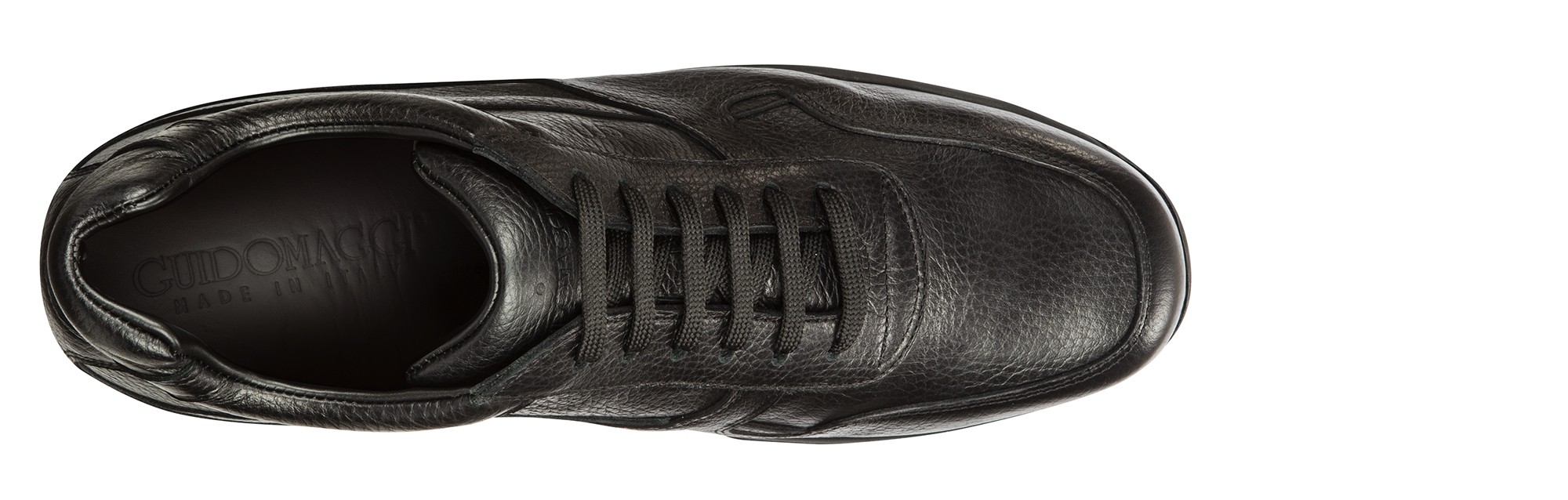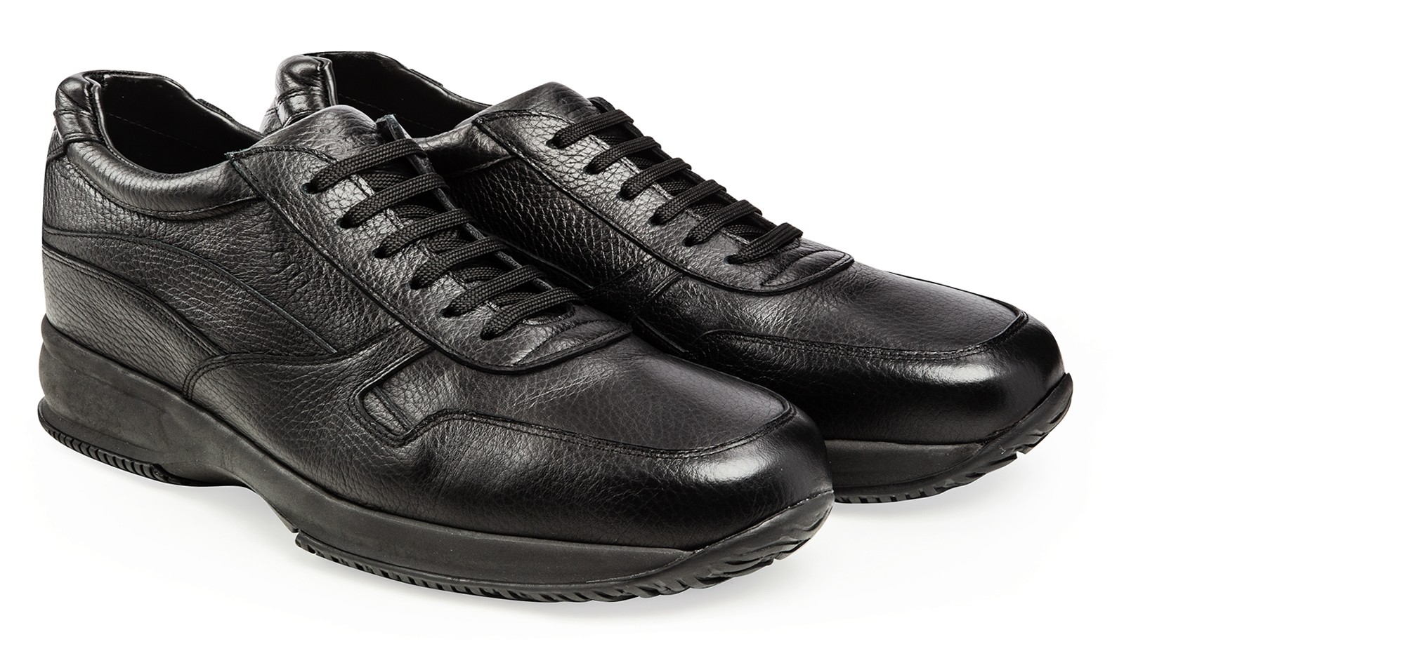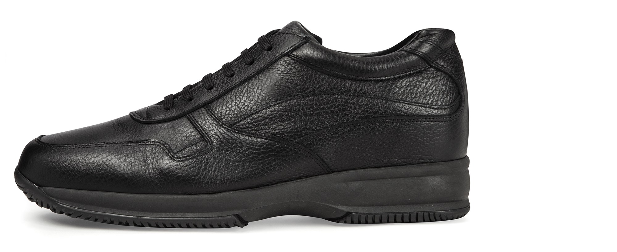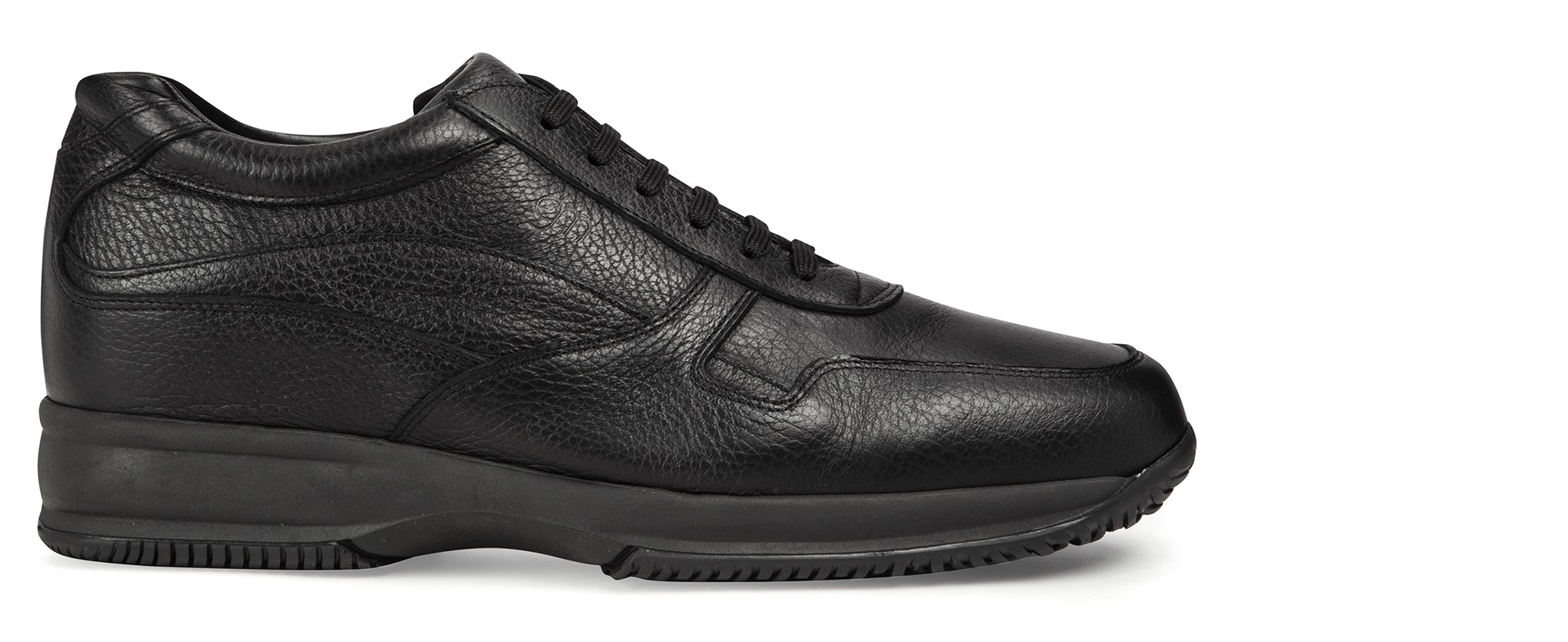 A sneaker with a casual style and a clean design, characterized by the upper in black hammered full-grain leather and tone on tone outsole made of 100% natural rubber.