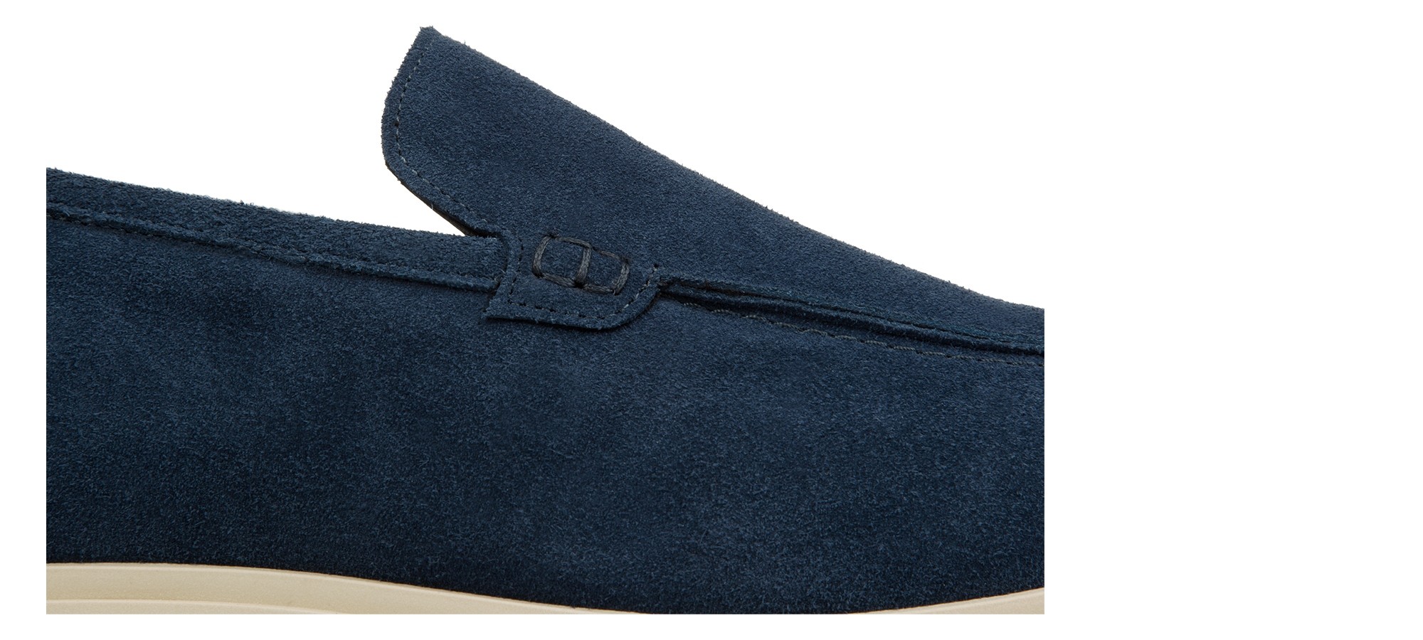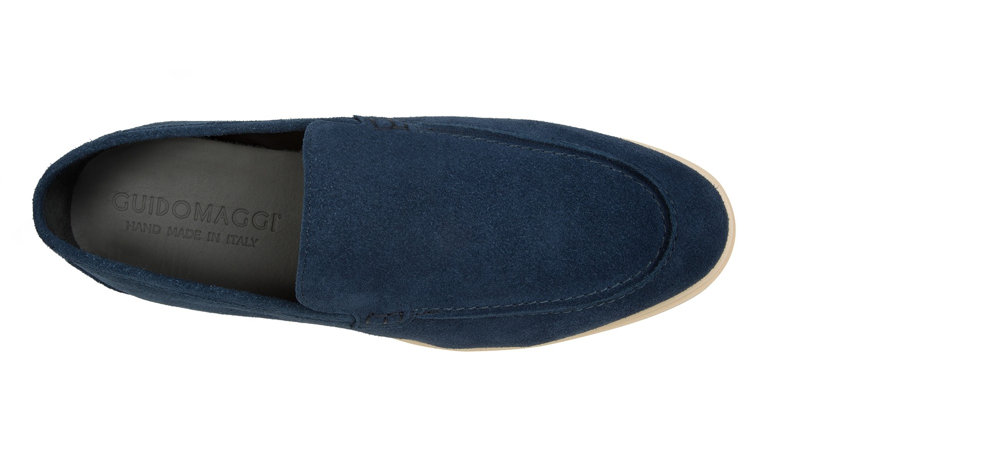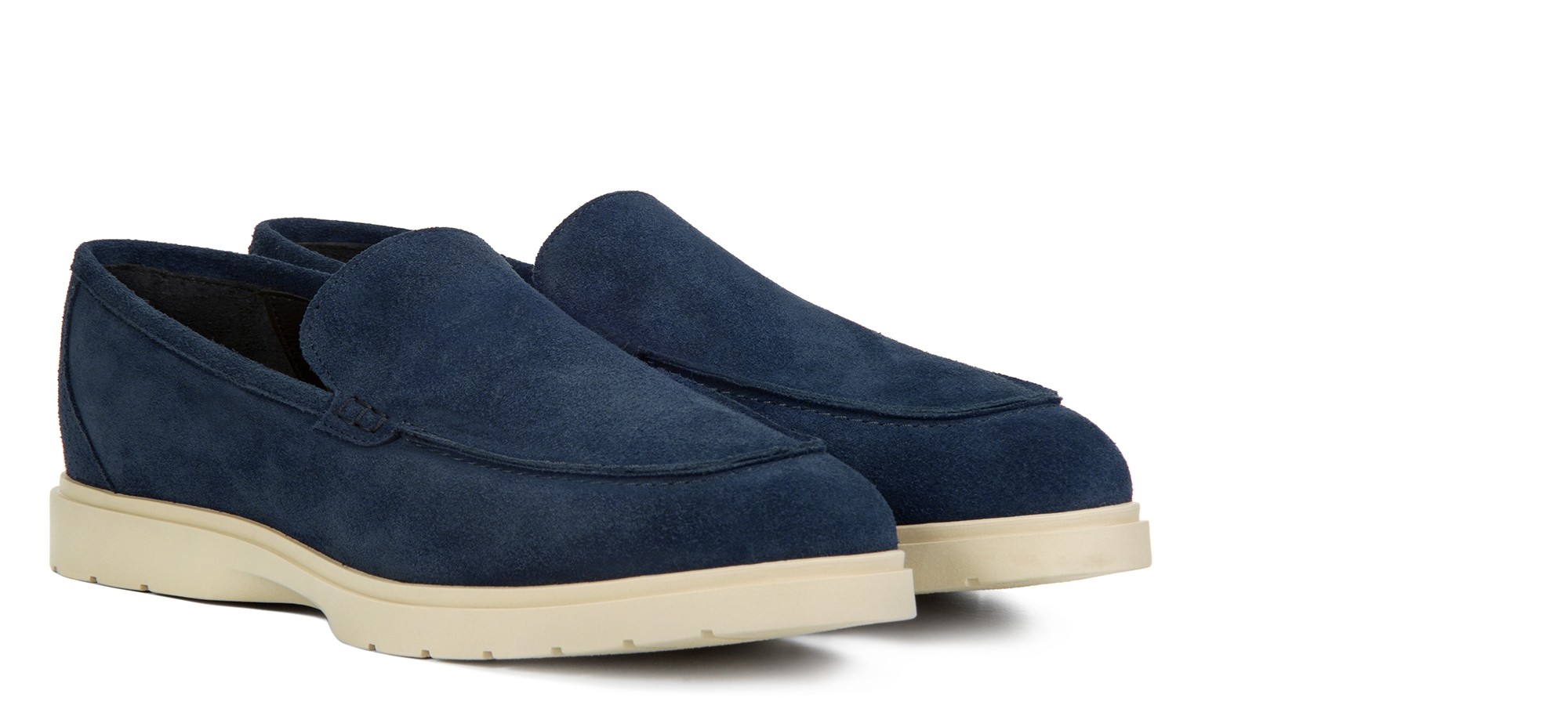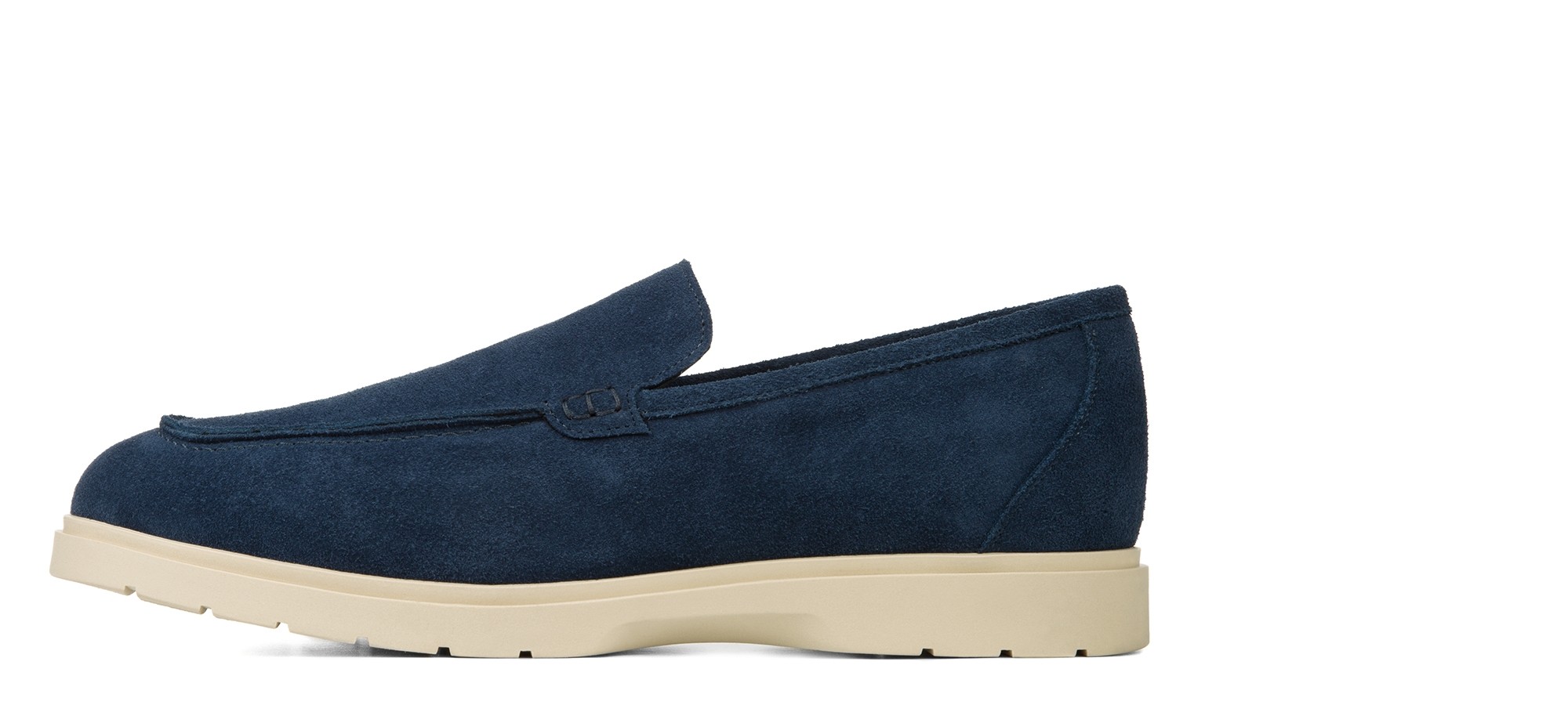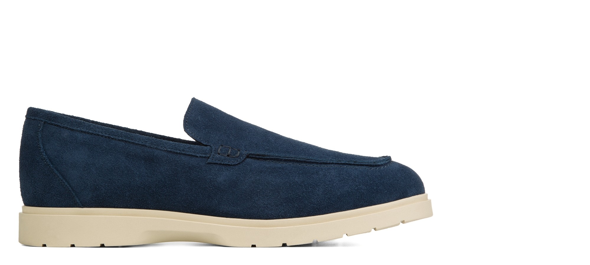 Handcrafted elevator loafer made from premium suede in a unique and deep shade of blue. Featuring a refined, entirely hand-stitched tubular construction, it offers a timeless casual-chic look. The cream-colored rubber sole, lightweight and flexible, creates an elegant color contrast while ensuring maximum comfort.