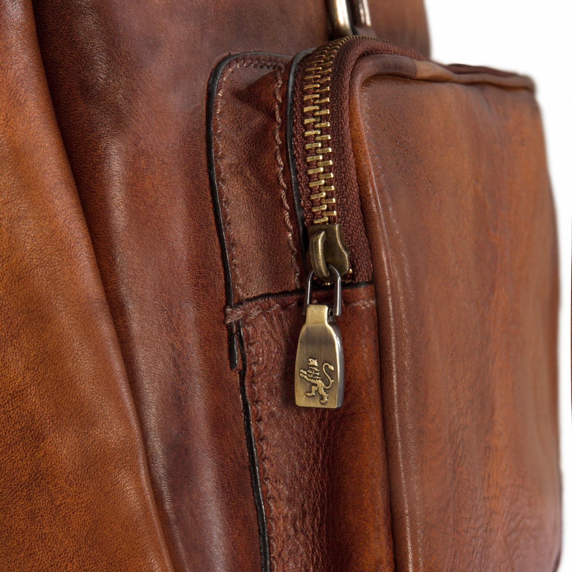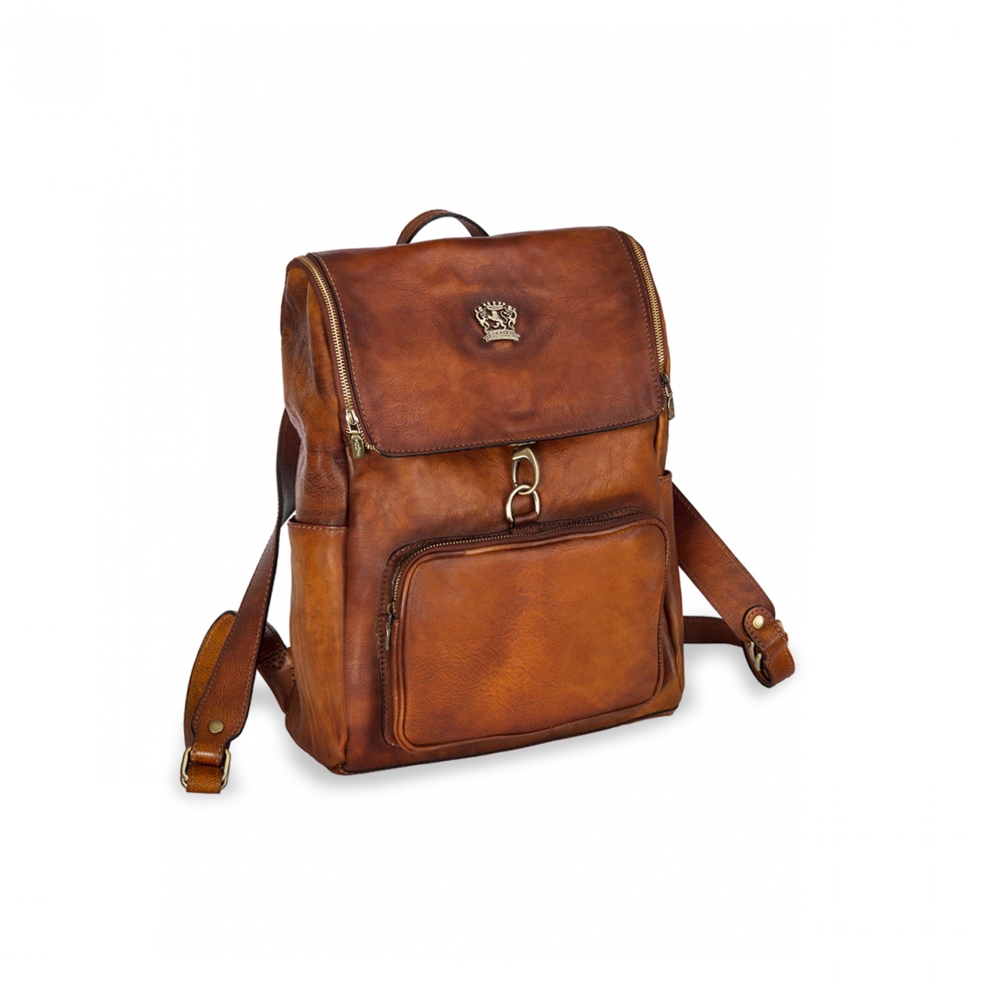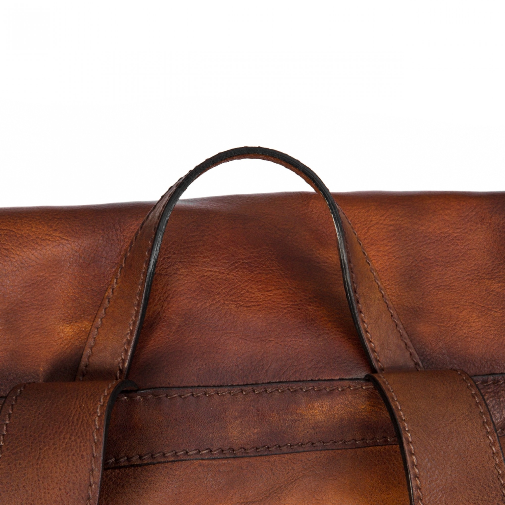 Refined and practical backpack made of light brown vegetable tanned Italian leather, made with a large internal space with a zippered pocket and LED light. On the front, a handy pocket to carry documents or smartphone.