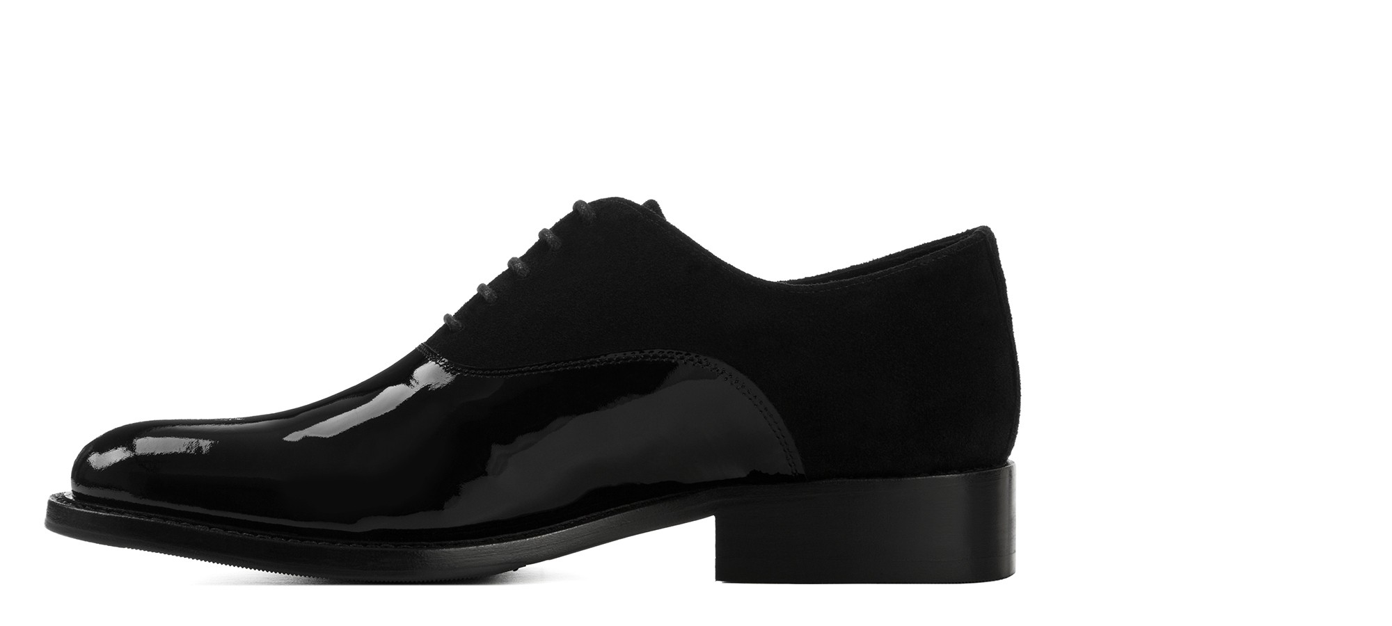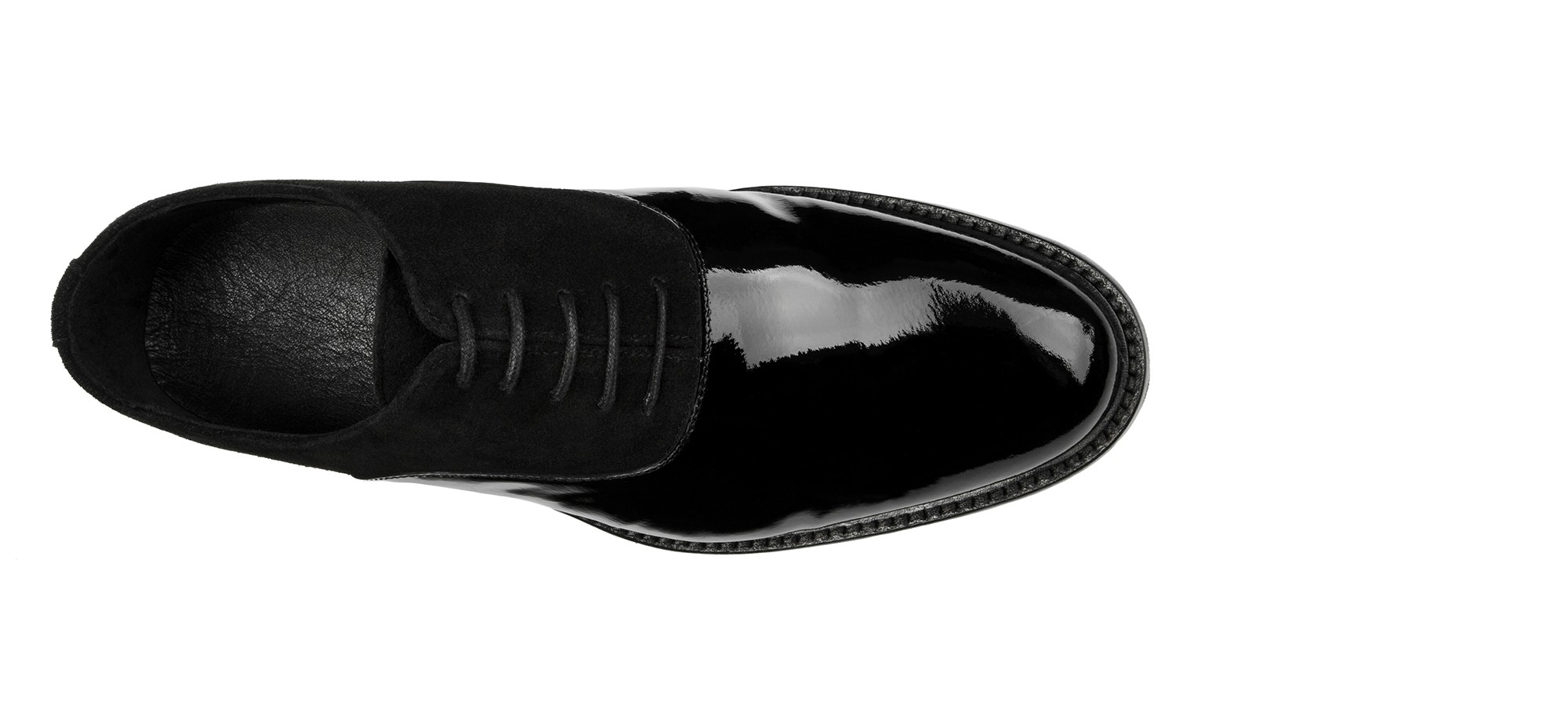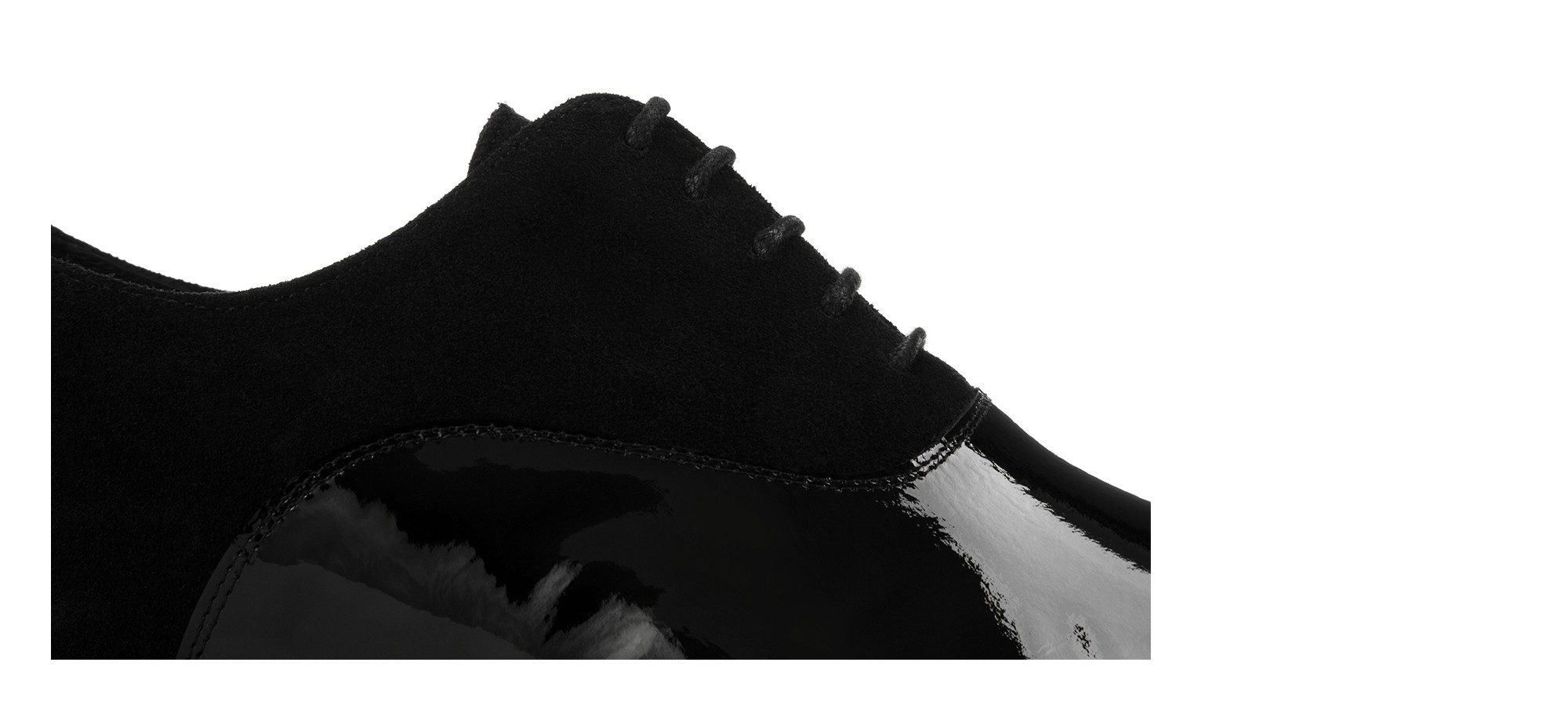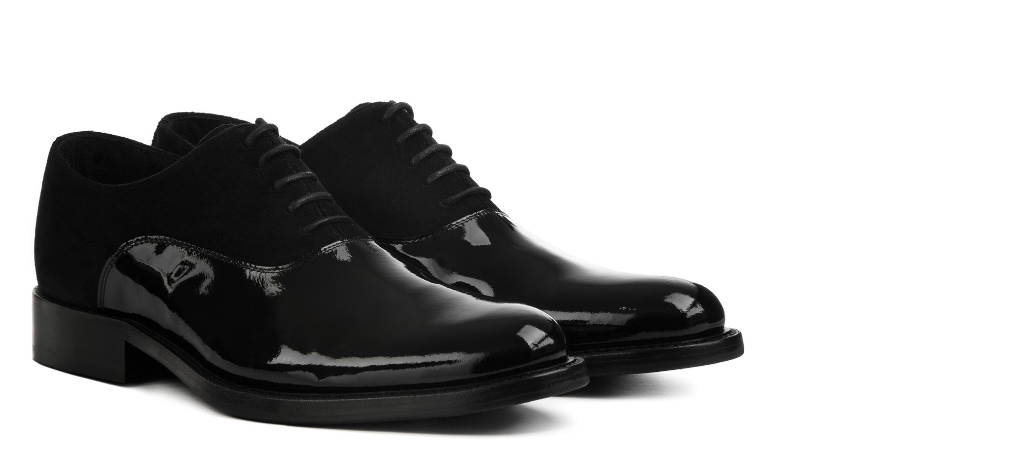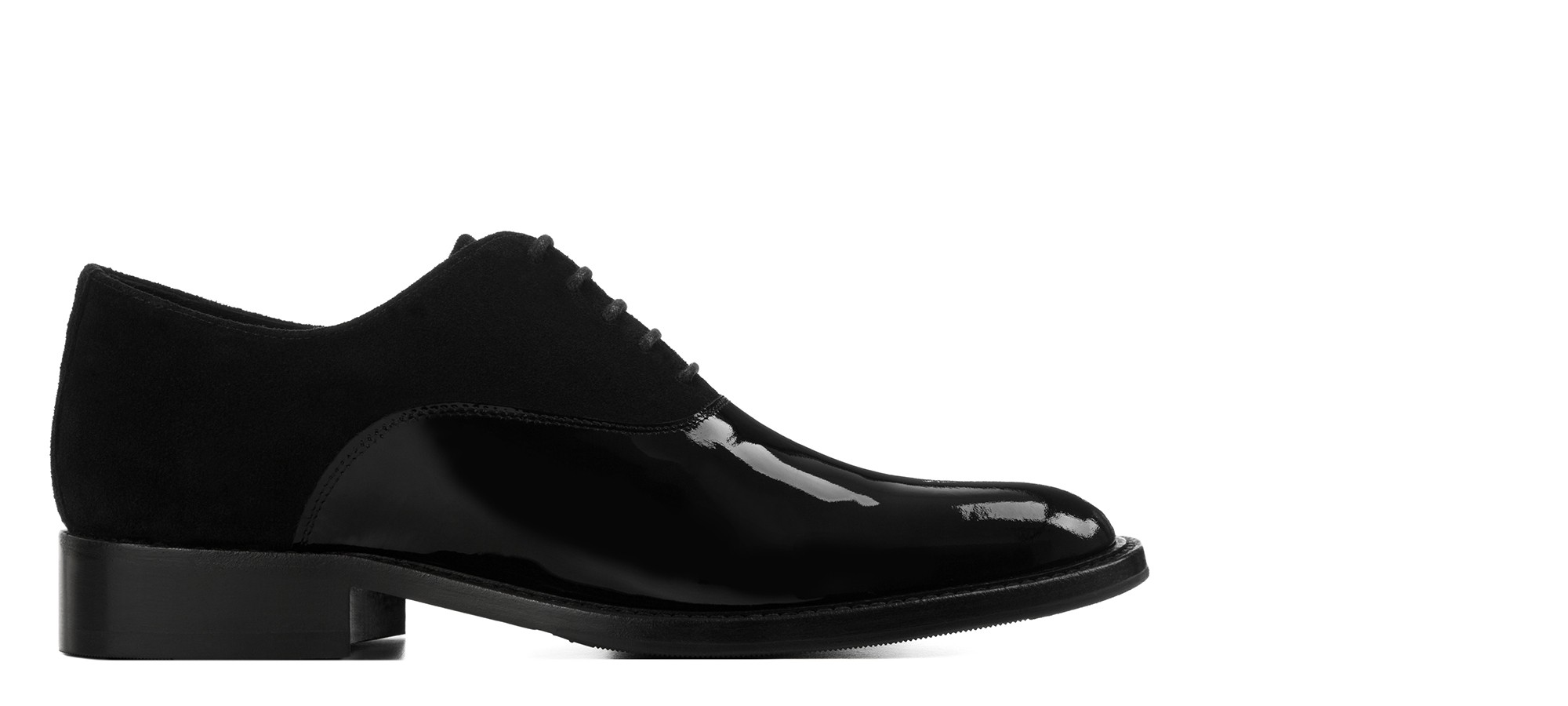 Refined handcrafted dress shoe that masterfully blends different textures for an extremely elegant result. The upper in soft black suede is enhanced by a brilliant patent leather front, creating a sophisticated contrast perfect for formal occasions and ceremonies. The sole is made of 100% genuine leather, ensuring quality and durability.