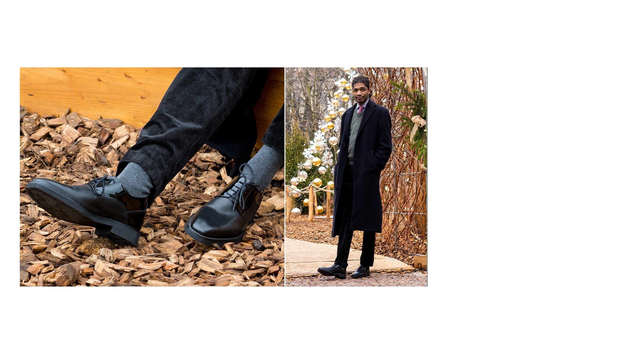 Classic elevator derby shoe featuring an elegant style and sophisticated lines. The upper combines black full grain leather on the toe with black patent leather on the quarters, creating a refined and luminous effect. The square toe adds a modern and distinctive touch to the design.