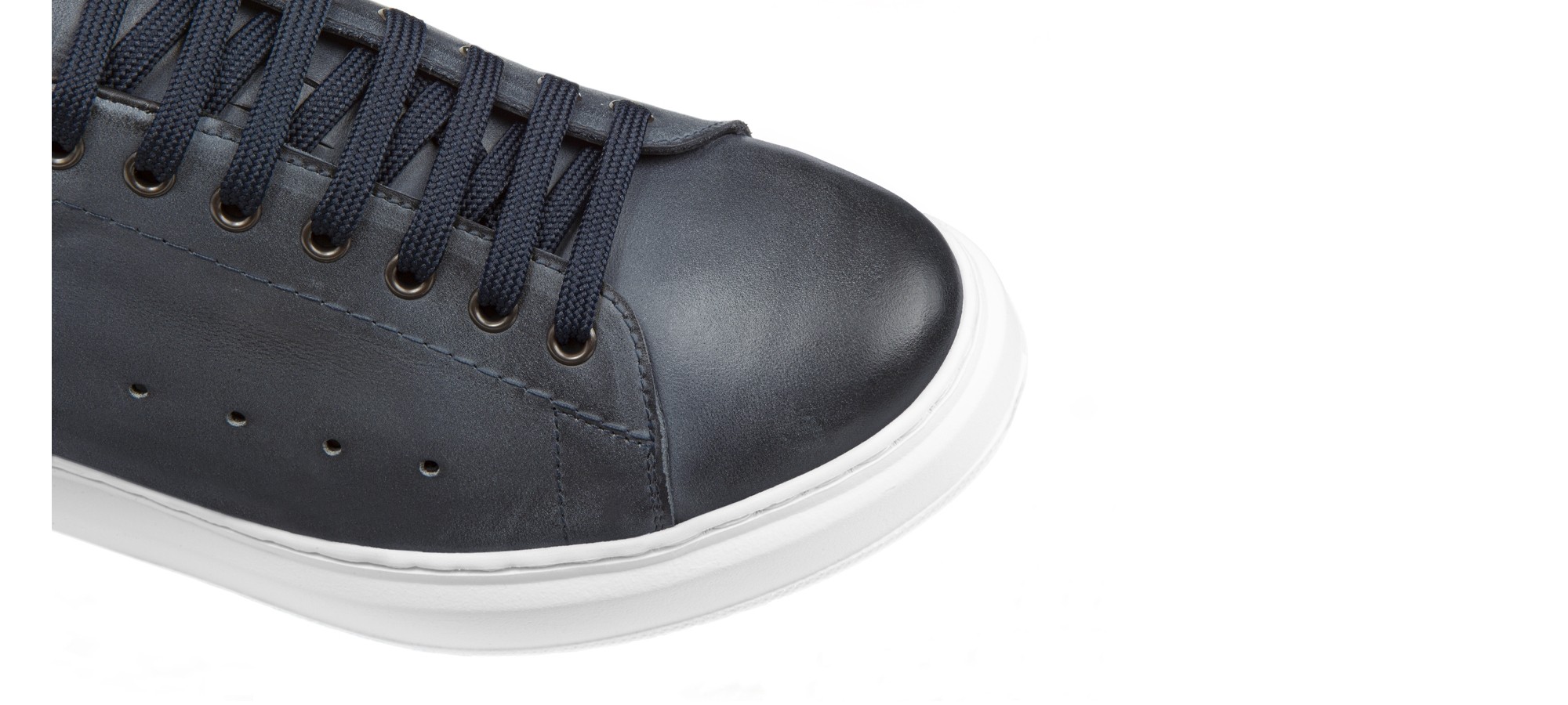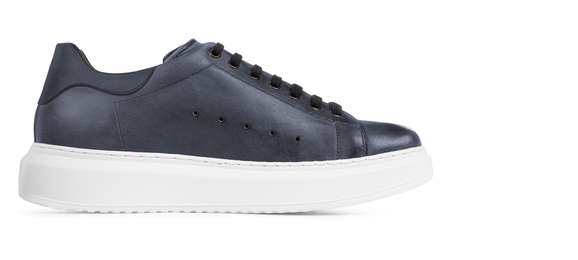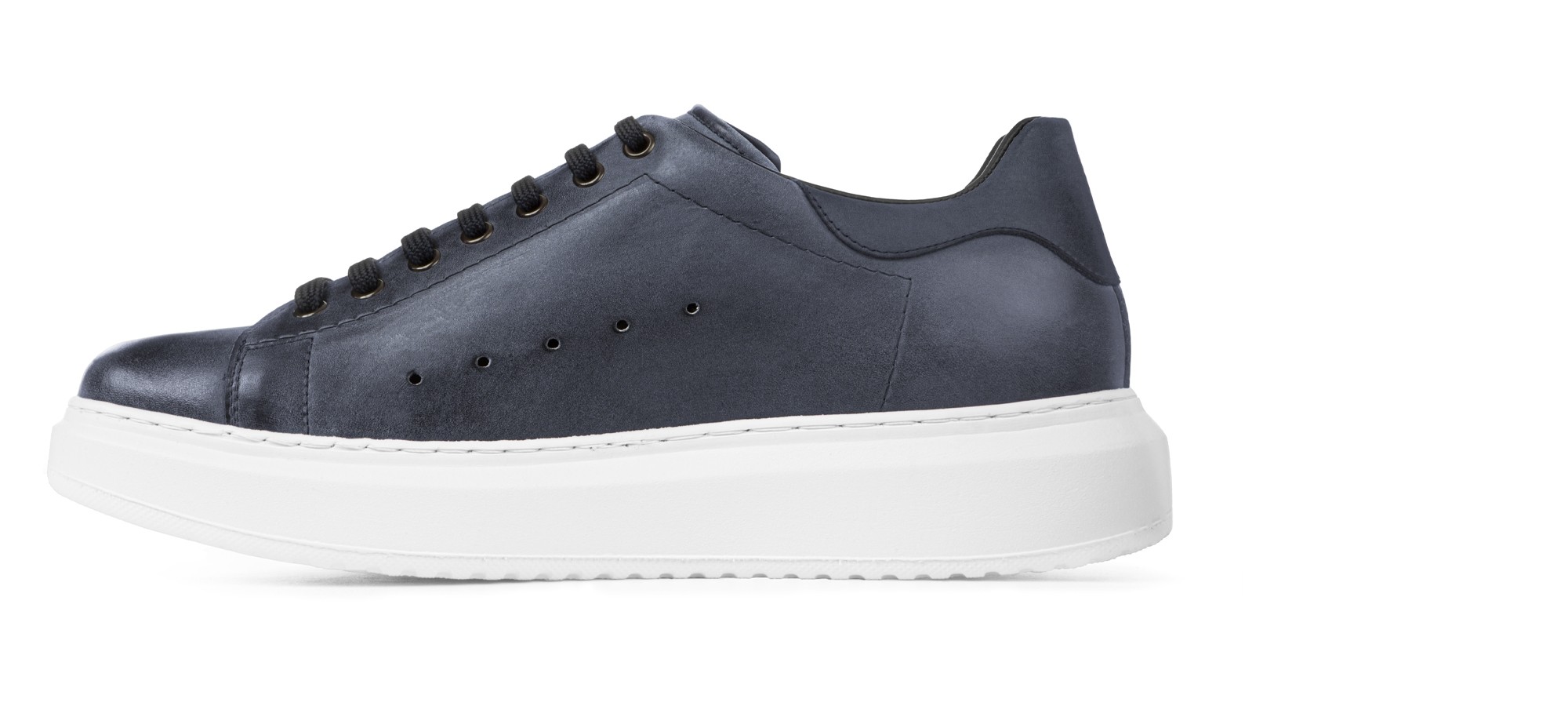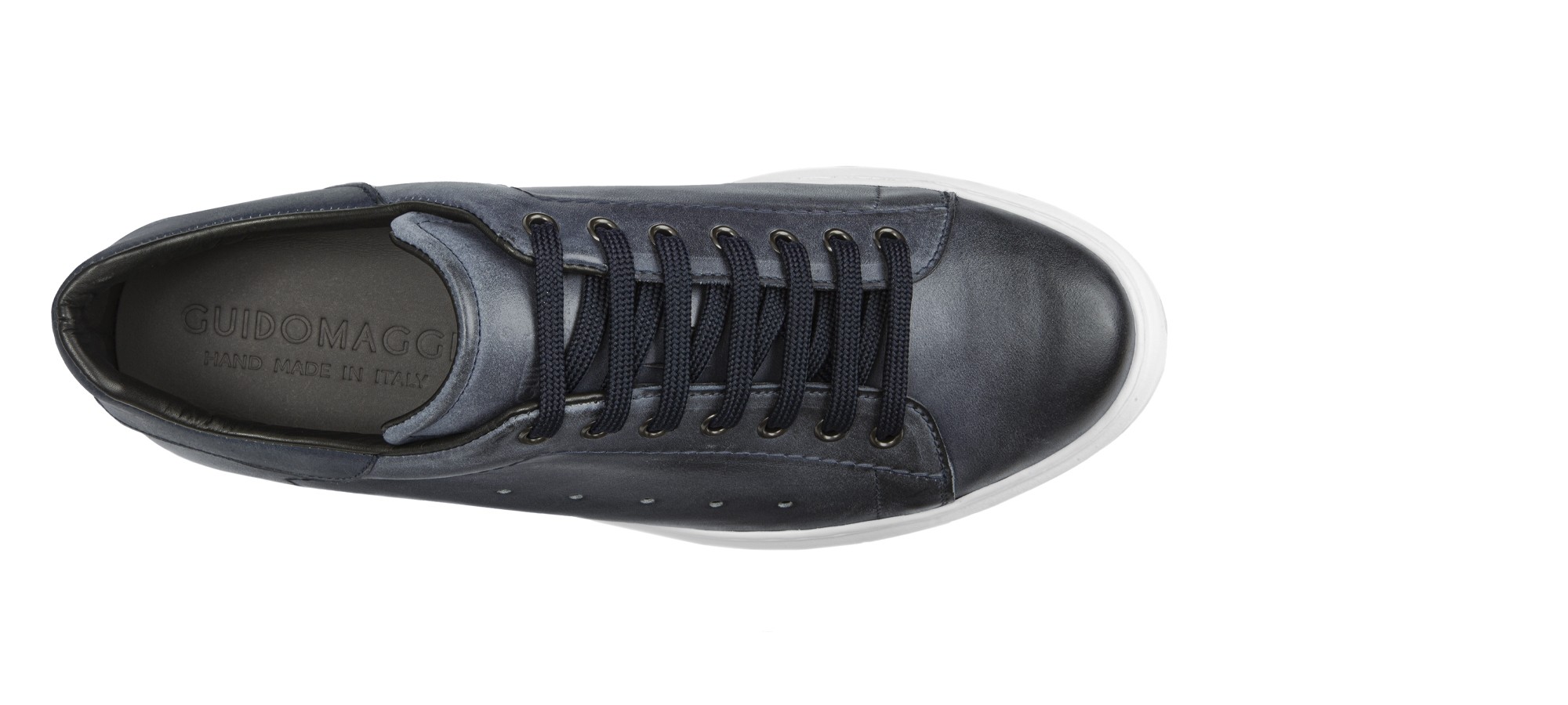 The new elevated sneakers by GuidoMaggi conquer for their urban chic soul. Dynamic but elegant at the same time, they cannot be missing in the wardrobe of the contemporary man, a lover of comfort and style. The model, ideal for seasonal casual chic outfits, offers up to 3.1 inches (8 cm) of height in total comfort and discretion. The white sole, in contrast, is in super light natural rubber. The upper is hand dyed through the patina processing in the nuance of blue. Handmade in Italy.
