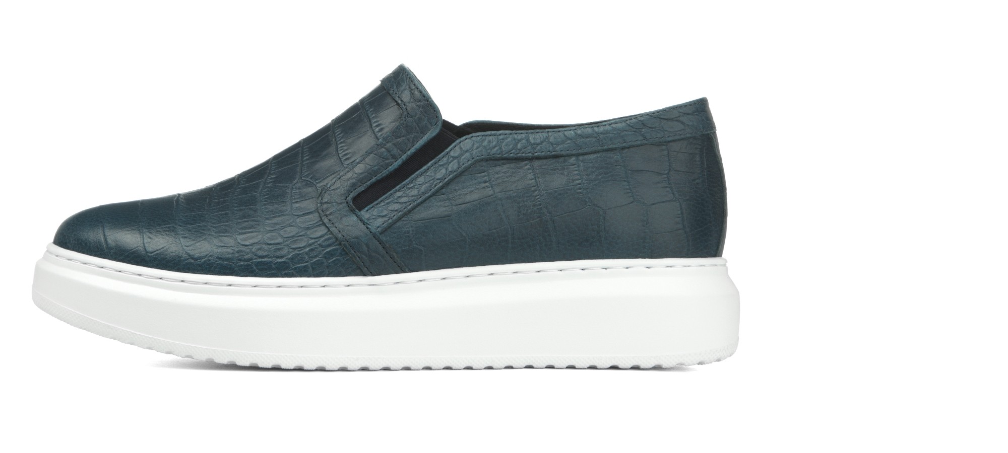 Elevator slip-on with upper in soft calfskin with a blue nuance, embellished with a sophisticated crocodile print. Clean lines and modern design for a versatile shoe, suitable for any summer outfit.The sole is in natural rubber, super light, hand-stitched.
