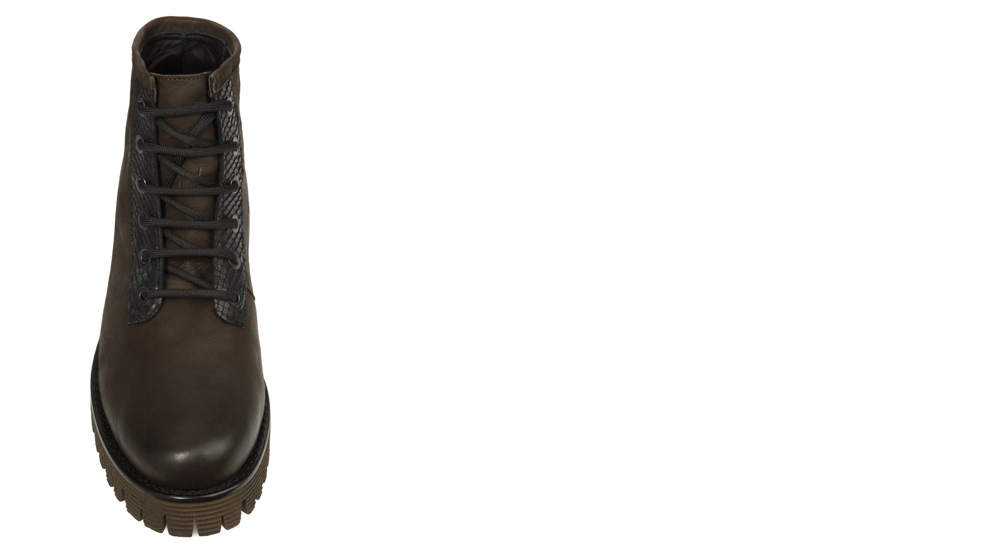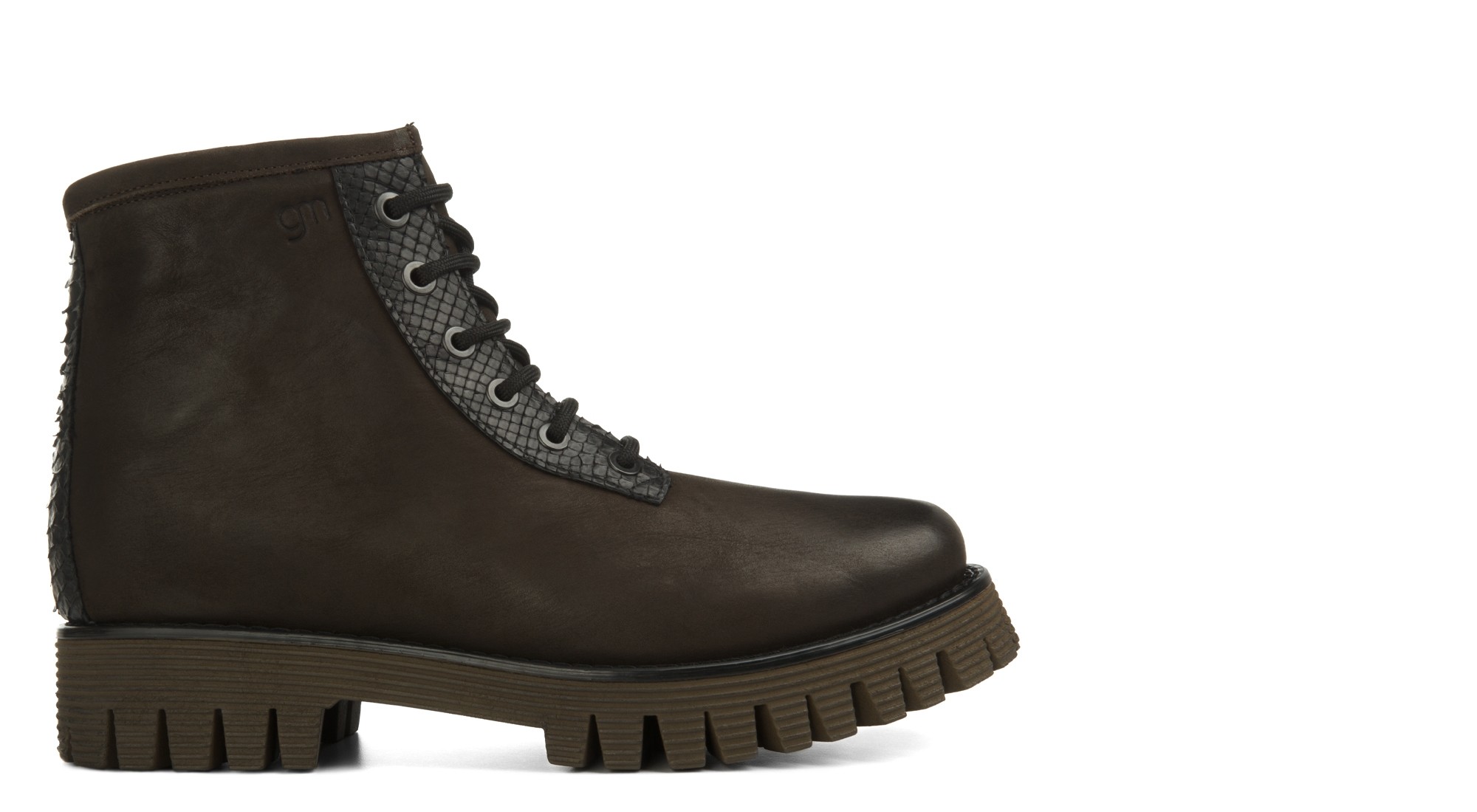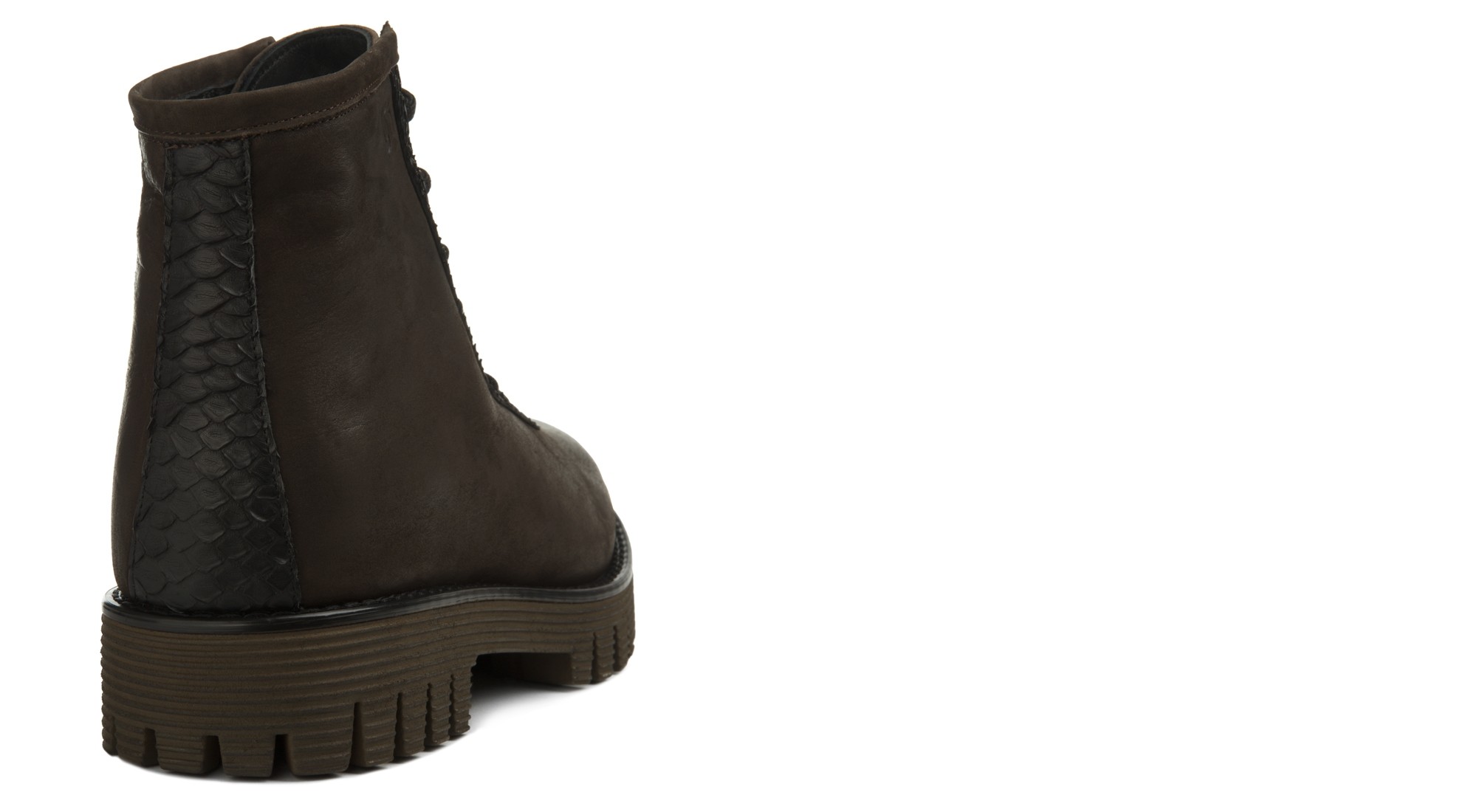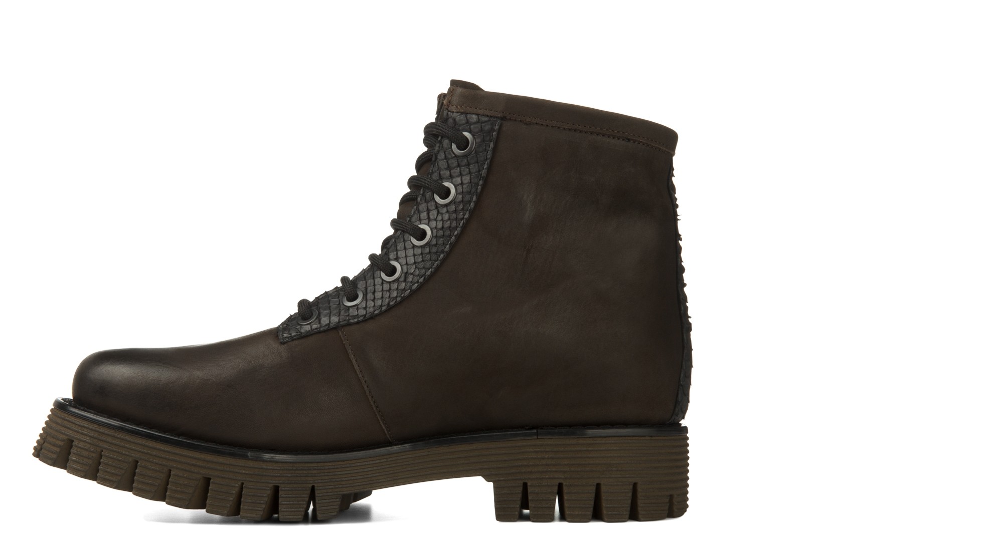 Boot with soft lines, perfect for casual chic looks. This elevator model is characterized by a nubuck leather upper in shades of brown with exclusive details in genuine matte black python skin.