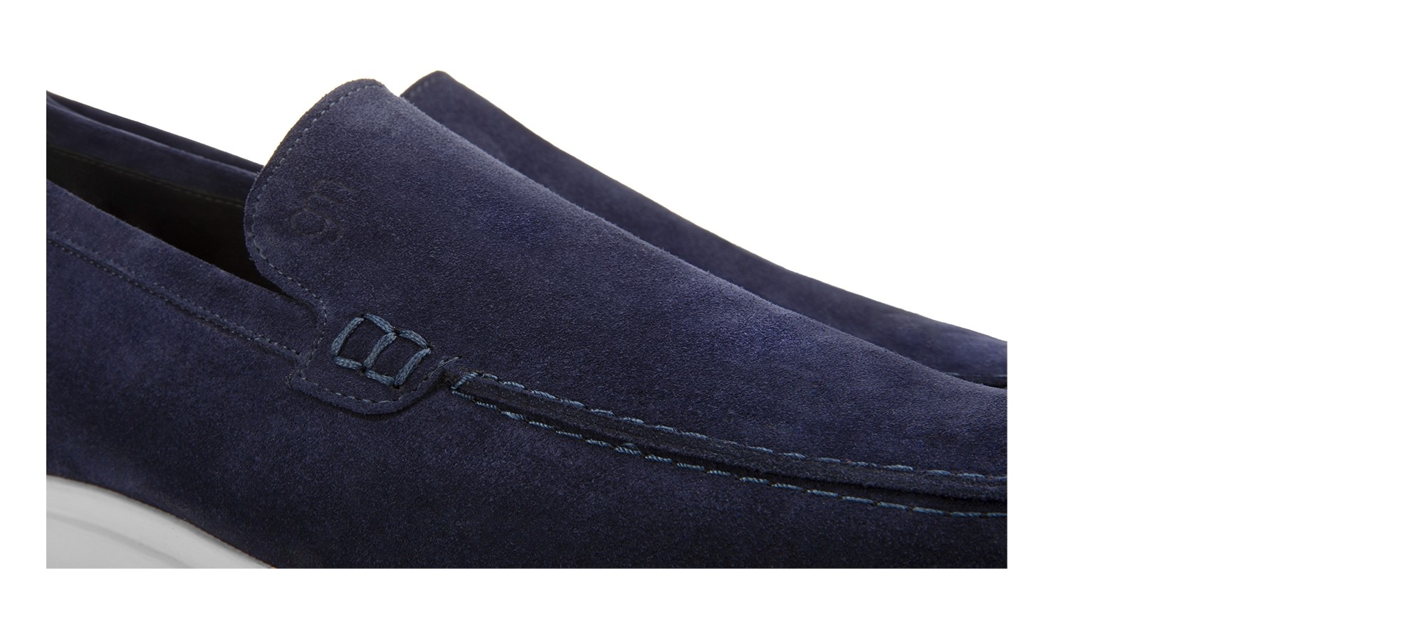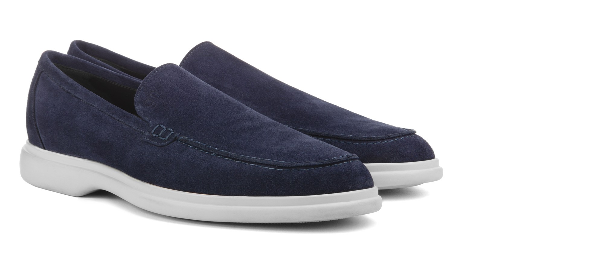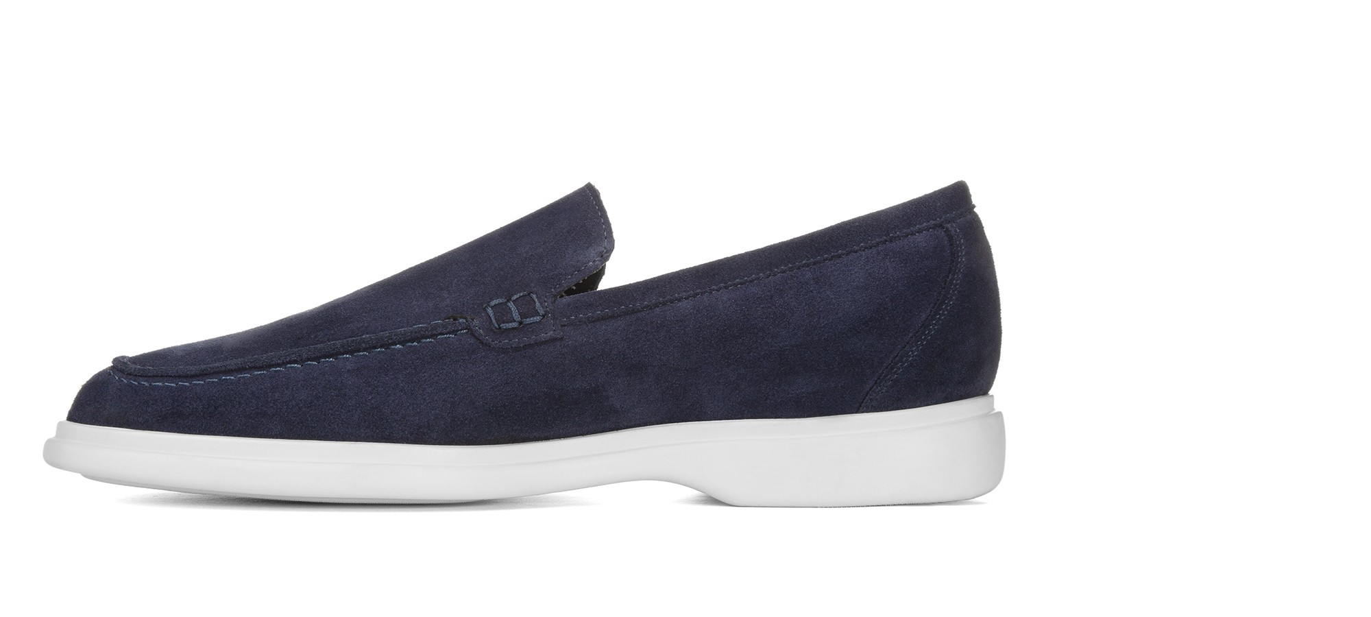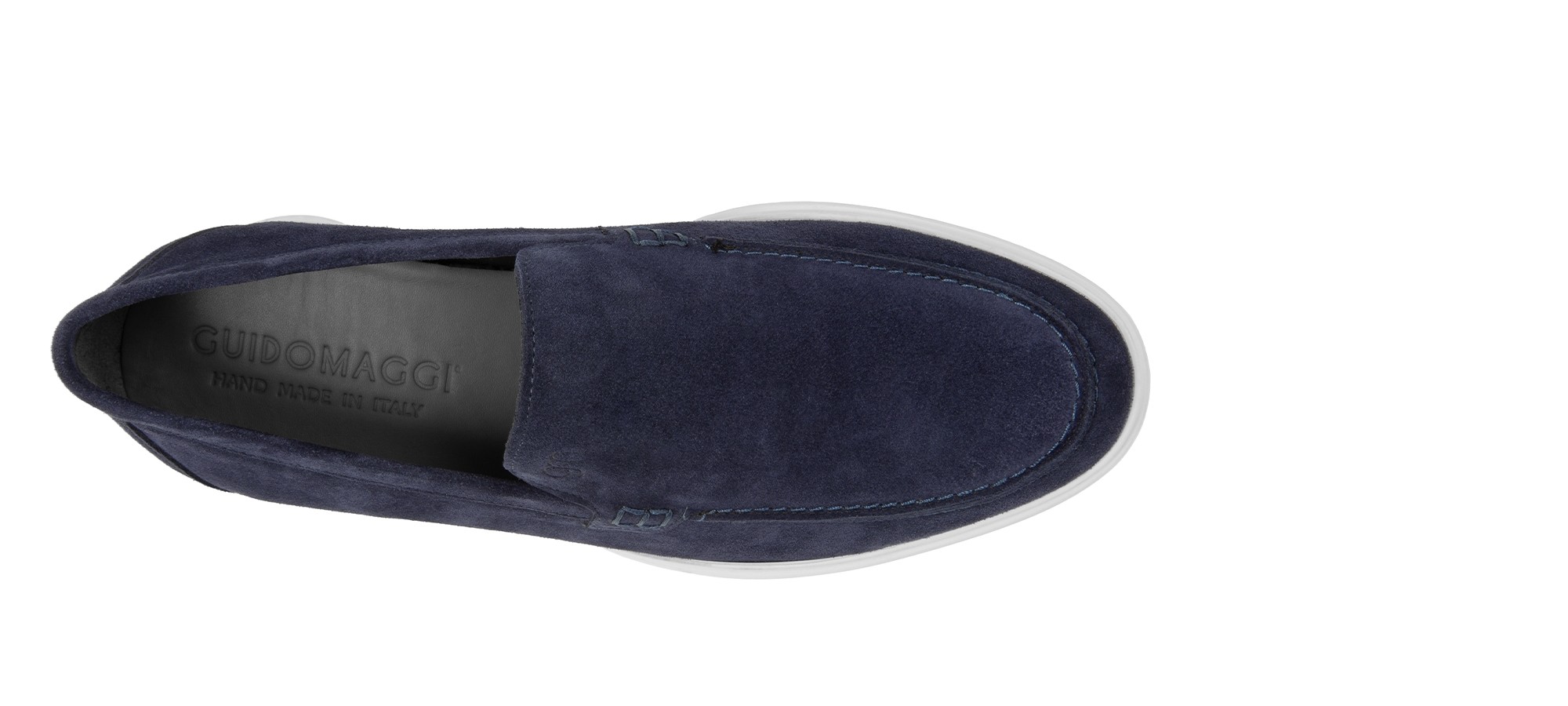 Height increasing loafers in soft suede leather, in a warm navy blue tone. Handmade in Italy by the skilled GuidoMaggi craftsmen, they are light and comfortable loafers, perfect for the casual chic looks of the season.